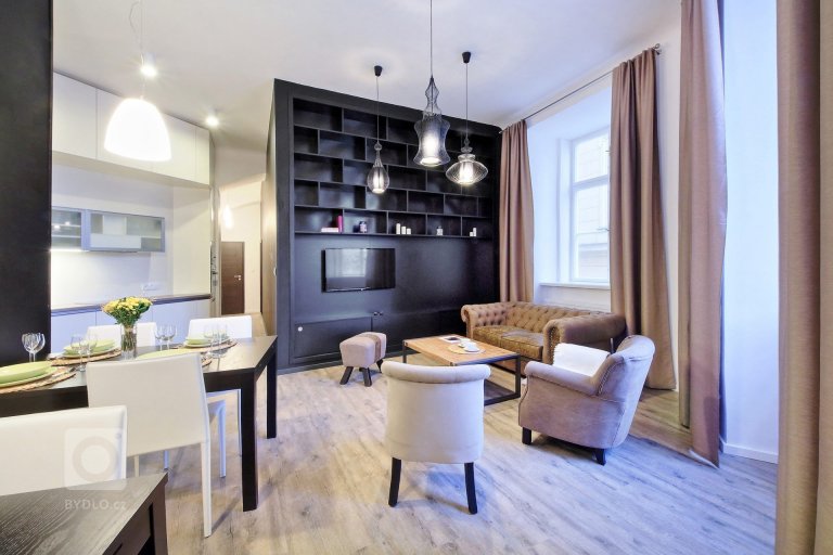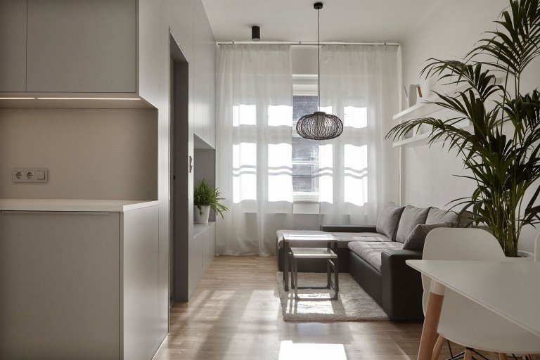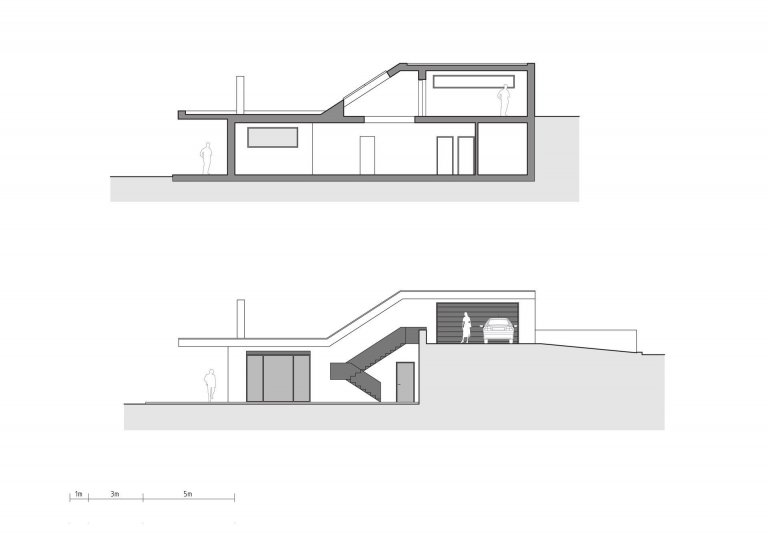 Hlavní vstup do domu se nachází pod venkovním schodištěm. Za ním vedoucí chodba prostupuje prostředkem domu a ústí do velkoryse navrženého obývacího pokoje s kuchyní. Stěny pokoje orientované jižním směrem, tvoří velké posuvné výkladce, které pokoj dokonale propojují s terasou a následně i zahradou a pouští dovnitř dostatek denního světla.