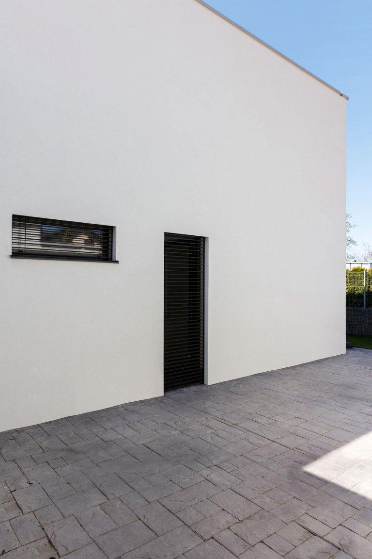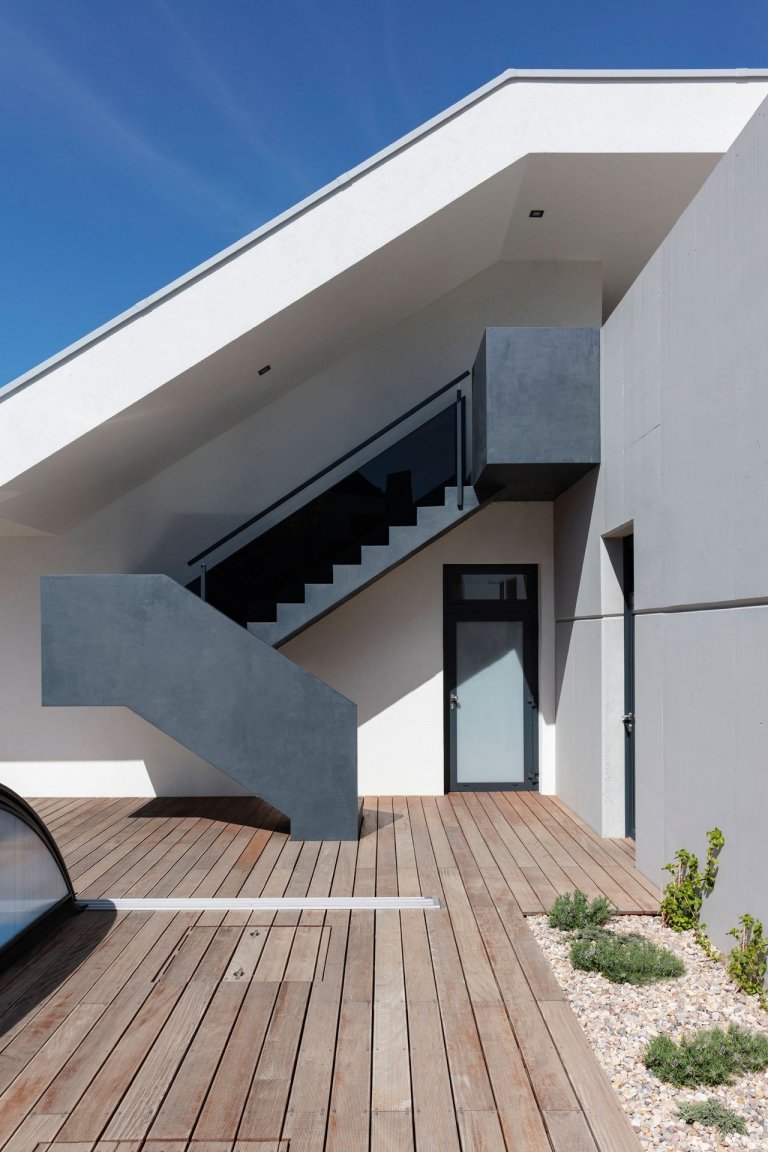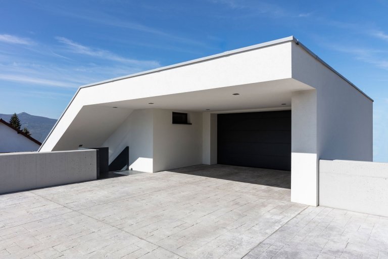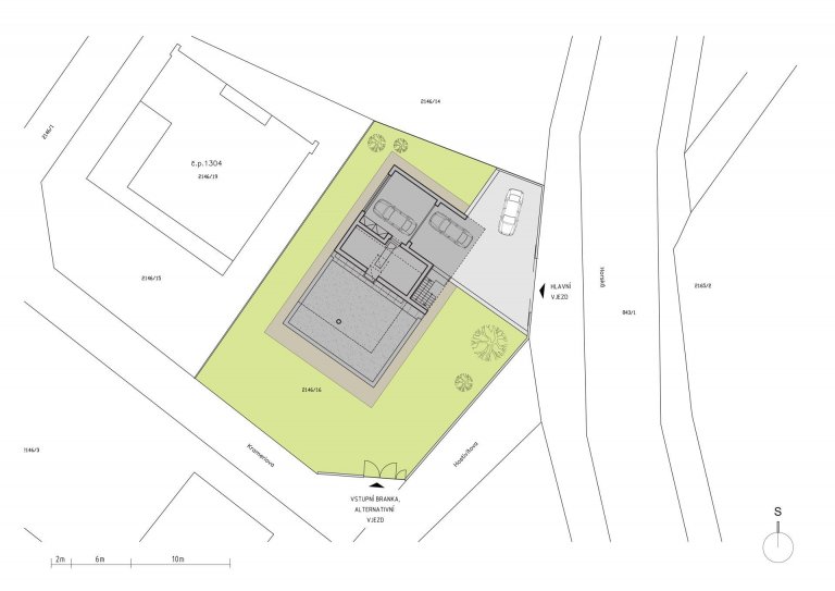 Z hlavní chodby je rovněž možné vejít do dvou dětských pokojů, sociálního zázemí a ložnice, disponující vlastní koupelnou a toaletou. Technická místnost a garáž pro dva osobní automobily byly navrženy do horního podlaží. Předprostor garáže nabízí venkovní kryté stání pro další dvě vozidla a dostatečný prostor pro manipulaci s nimi.