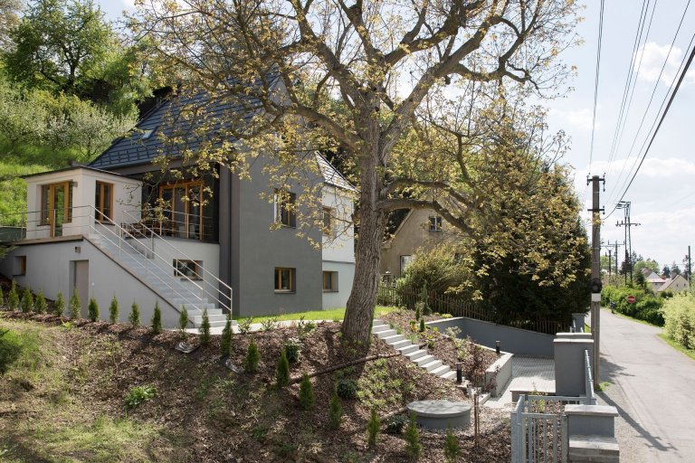 Rodinný dům Horská se nachází ve stejnojmenné ulici a stojí na svažitém pozemku. Je koncipován jako jednoduchá dvojúrovňová stavba s úrovněmi rozdělenými podle terénu. Horní část, která leží v úrovni ulice Horská, slouží pro příjezd a parkování vozů, dolní je určena pro zahradu. Na tyto úrovně funkčně navazují dvě podlaží budovy. První patro tvoří parking a technická místnost, přízemí zabírají obytné prostory a zázemí. Obě podlaží propojuje výrazné venkovní schodiště z betonu, na které navazuje opěrná zeď vymezující předprostor s bazénem. Schodiště je kryto zalomenou střechou. Ta zároveň funguje jako stínící prvek dřevěné terasy před slunečními paprsky a deštěm. Výškové rozdíly jsou v exteriéru řešeny opěrnými betonovými zdmi, u kterých se v budoucnu počítá s estetickým zakrytím obrůstající zelení.