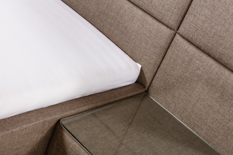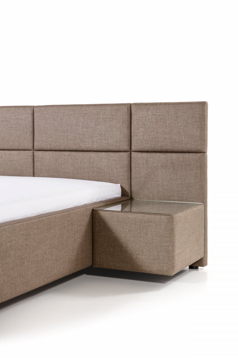 Čalouněná postel s čelem poskládaným ze symetrických obdélníků. Lze přidat noční stolky.