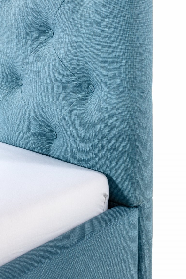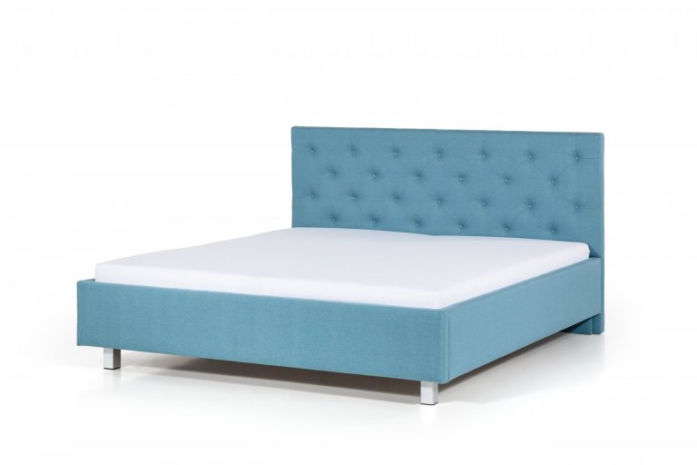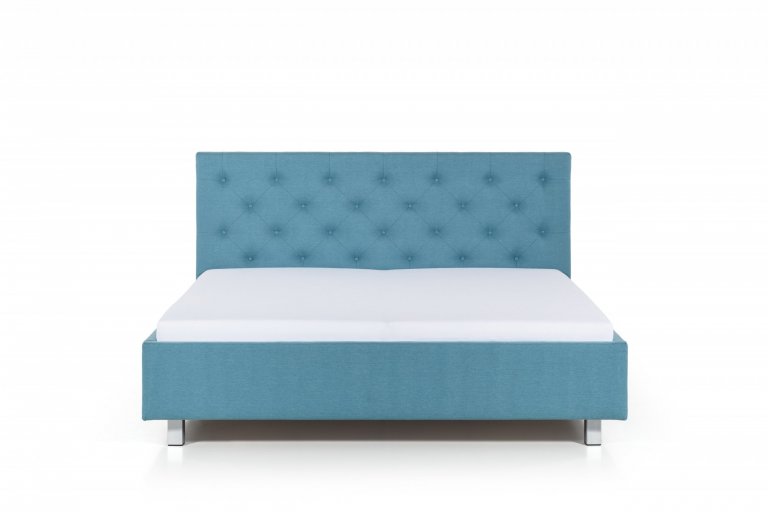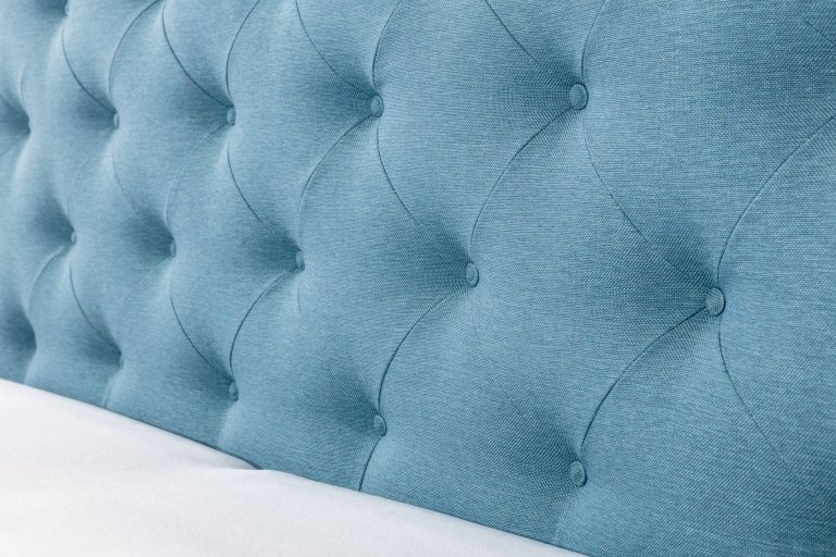 Čalouněná postel s čelem ozdobeným čalounickými vtahy s knoflíky