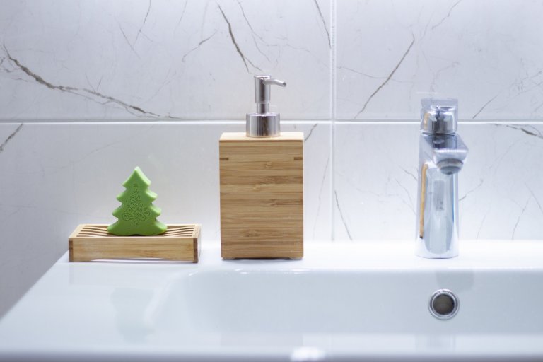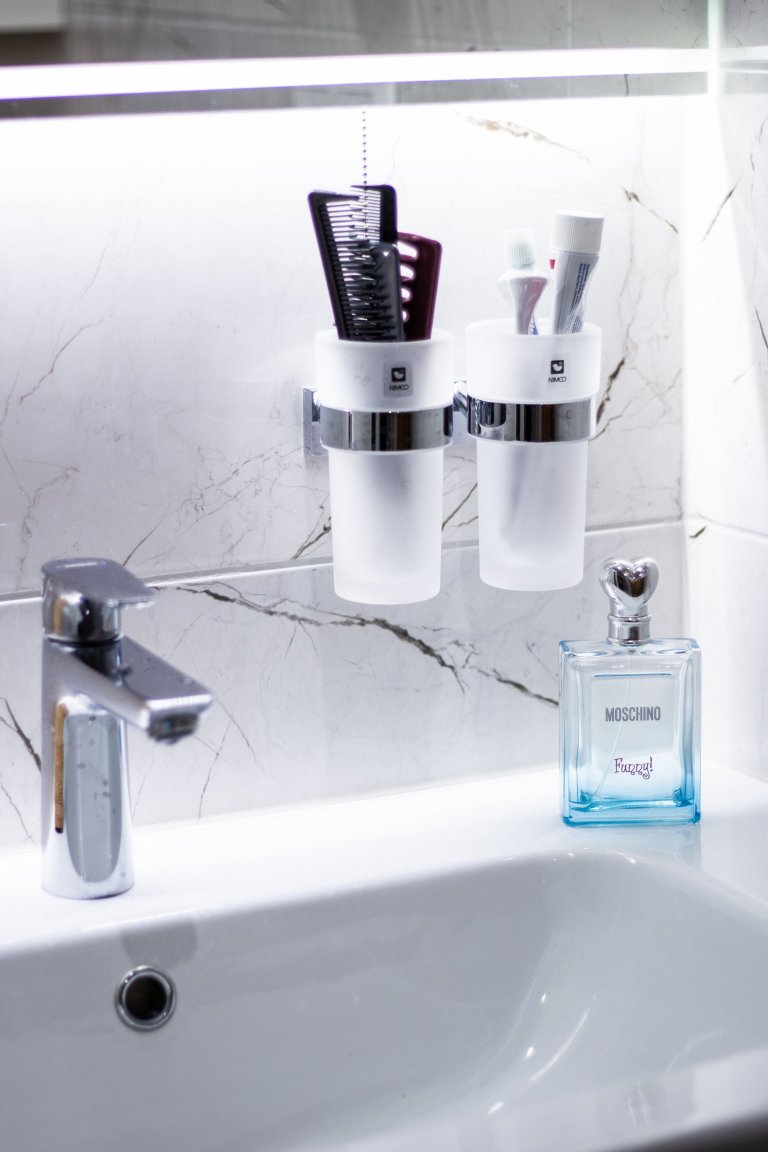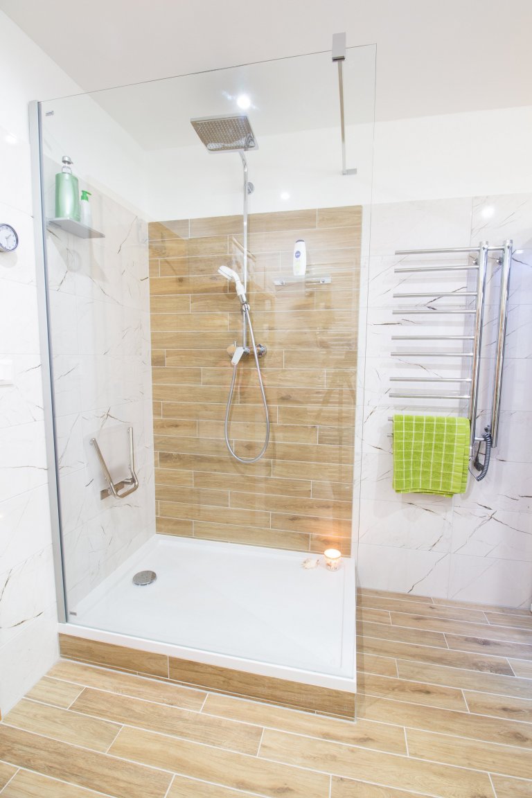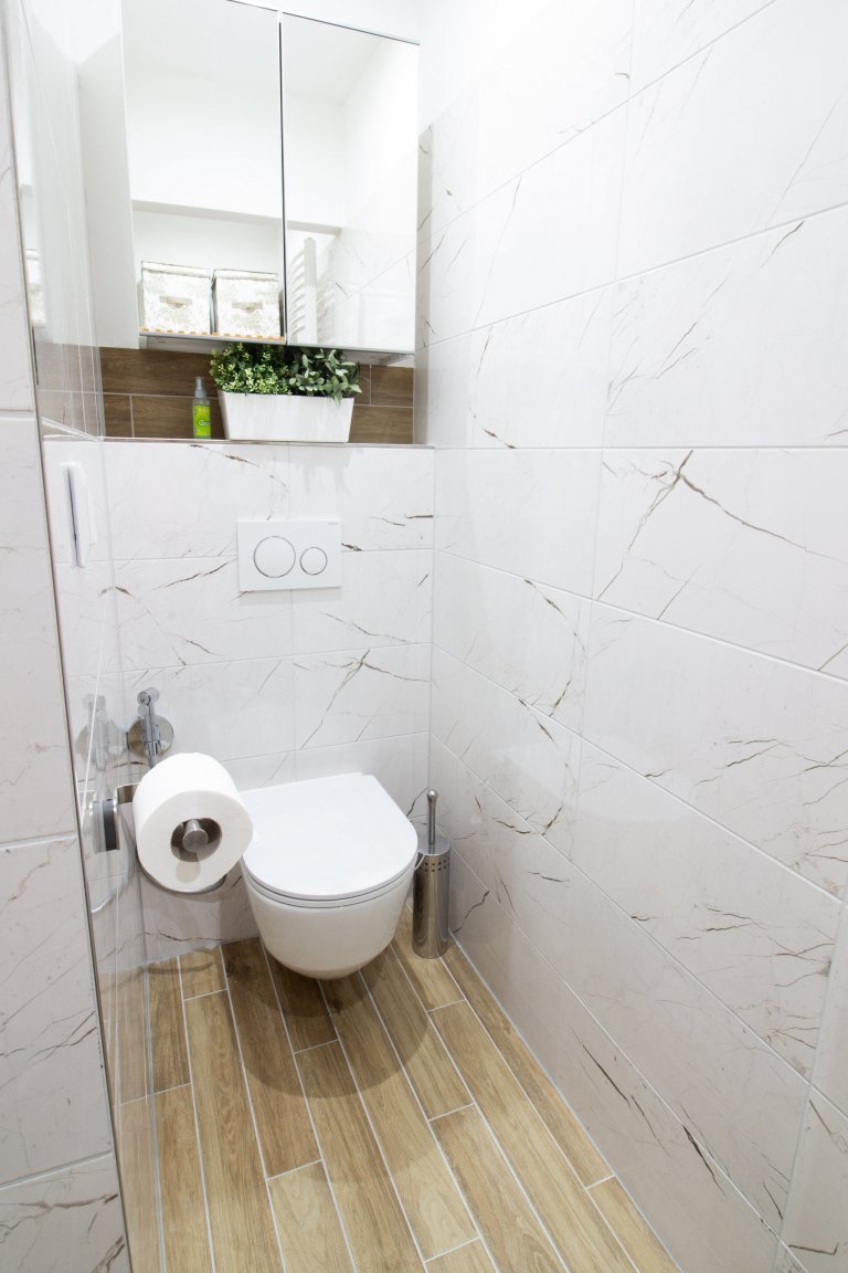 Imitace mramoru se stále více dostává do popředí a v kombinaci s dřevodekorem dodává celé koupelně útulný a přitom moderní vzhled. Dřevodekor jsme navrhly na podlahu, na sprchovou stěnu a část niky nad WC. Samotná sprcha ve stylu WALK-IN je stále žádanější variantou, která svojí vzdušností sluší každému interiéru. K závěsnému WC nechybí bidetová sprška.
