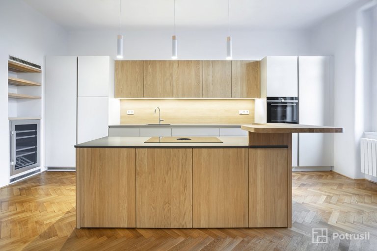 Pan Jakub s Veronikou si přáli kuchyň do svého domu z kvalitních materiálů, proto jsme volili pracovní desku z žuly a k ní skvěle padnoucí skleněný obklad. Celý interiér byl podtržen dýhovanými a lakovanými prvky.