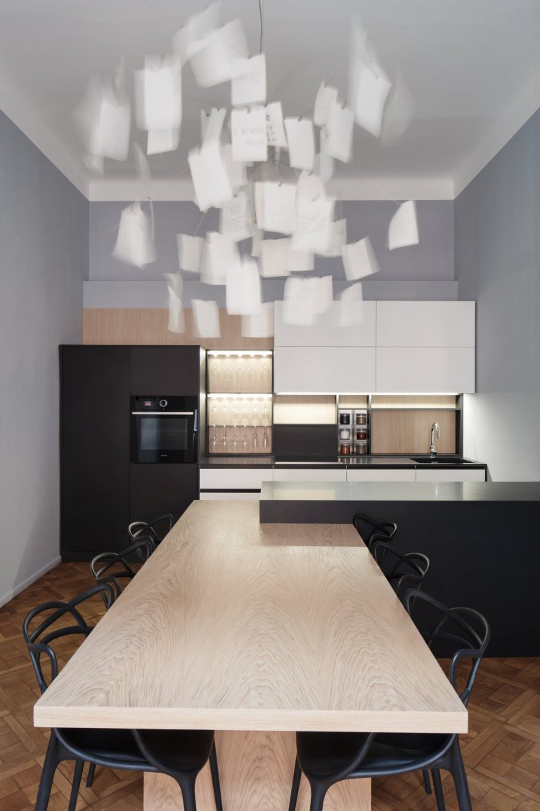 Moderní kuchyně citlivě korespondující s bytem v historickém domě v Královských Vinohradech. Použity byly materiály jako: černý Corian, bělená dubová dýha. Dominantou je lustr od Ingo Maurer, interiér vhodně doplńují židle Kartell Masters.
