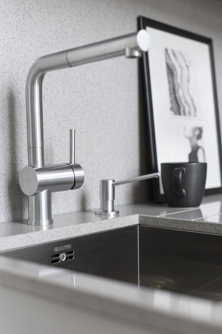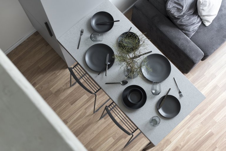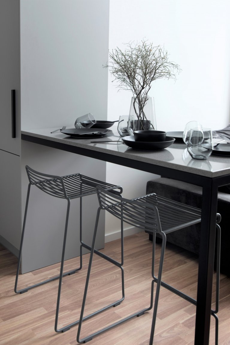 Všechny zóny se nacházejí v jedné místnosti, proto jsme celý prostor sjednotili dekorem na vestavěném nábytku. Celý byt tak tvoří jednotný celek.