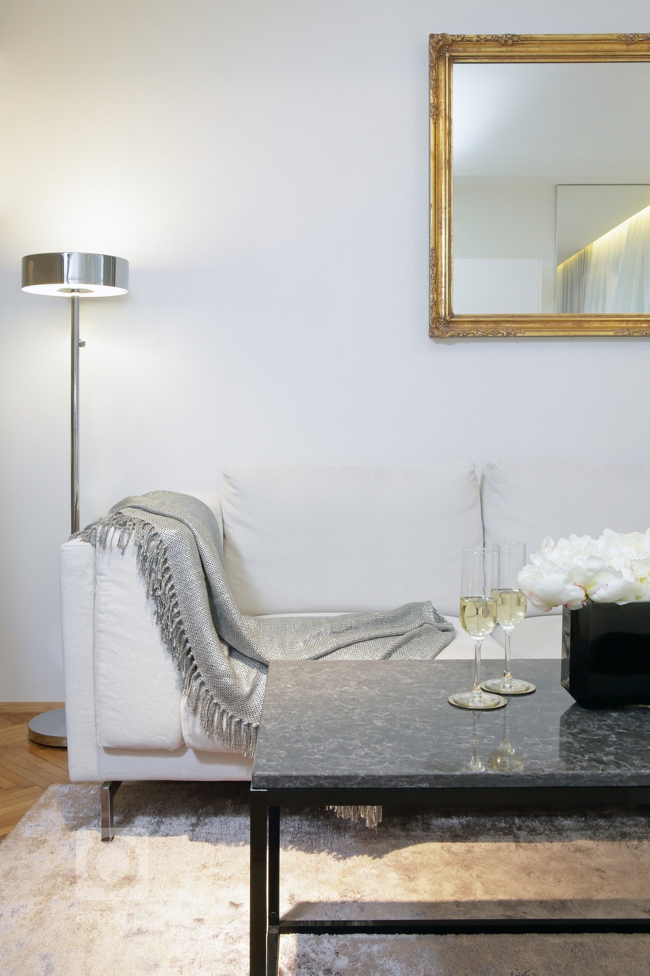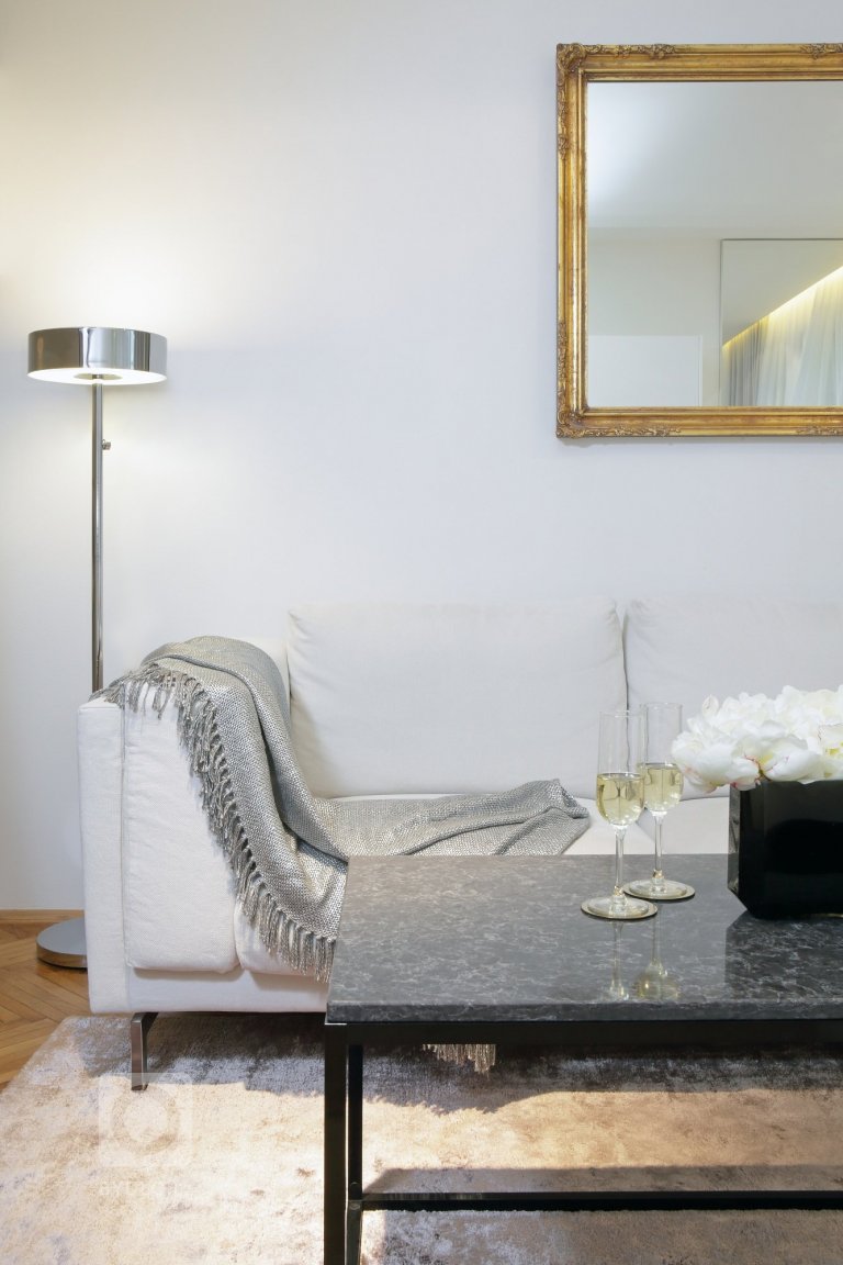 Byt prošel kompletní rekonstrukcí, Zachovali jsme však původní parkety v obývací části a zrcadlo nad sedací soupravou. Odstup sádrokartonového podhledu u oken umožňuje zakrytí lišty pro závěsy a zároveň vsazení LED osvětlení, které dotváří příjemnou atmosféru v pokoji. .Za zrcadlem vedle…