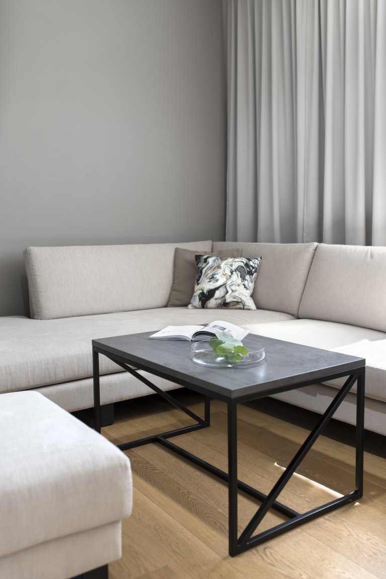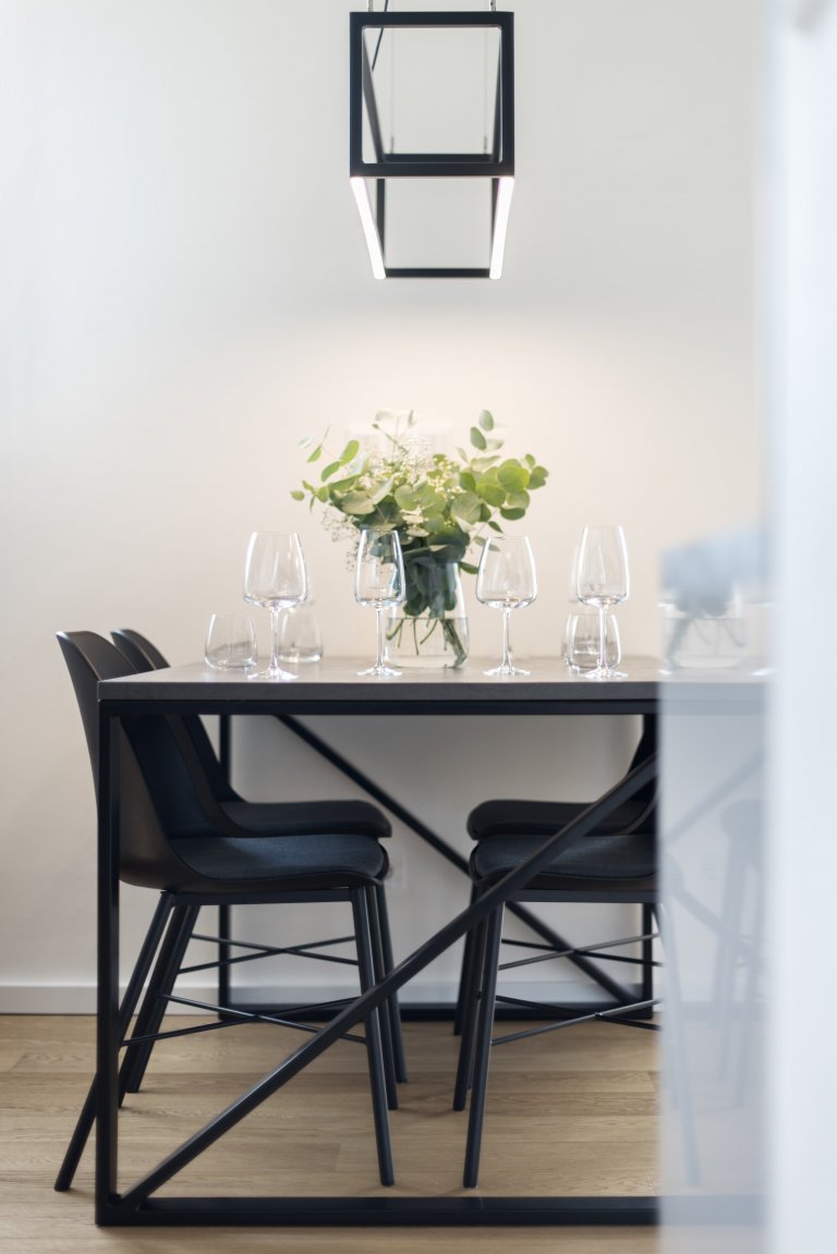 Celý prostor propojuje dekor pracovní desky, který se prolíná i na jídelním a konferenčním stolu.