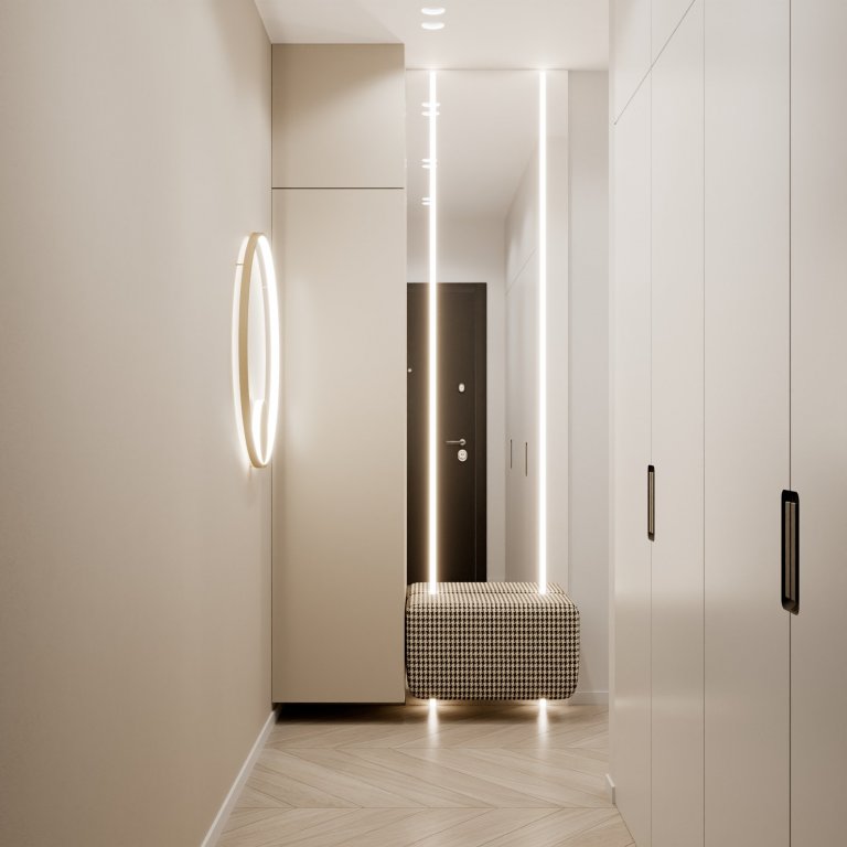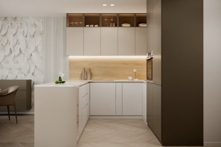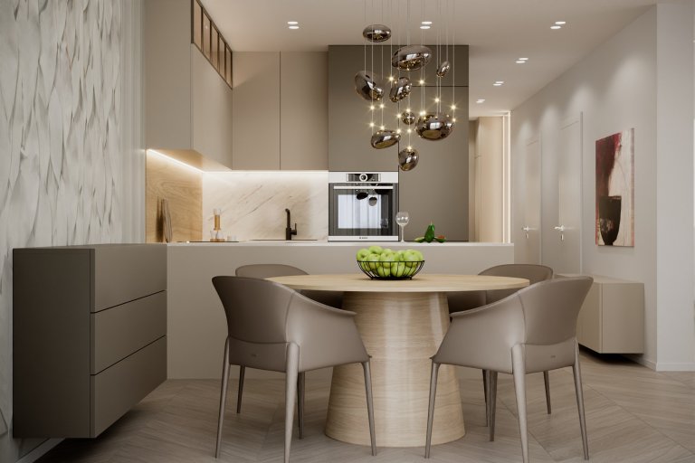 Jemný, béžový interiér, tón v tóne, príjemný minimalizmus, dizajnové solitéry, to všetko vytvára príjemné, rodinné bývanie v projekte Čerešňe od štúdia PRUNUS.