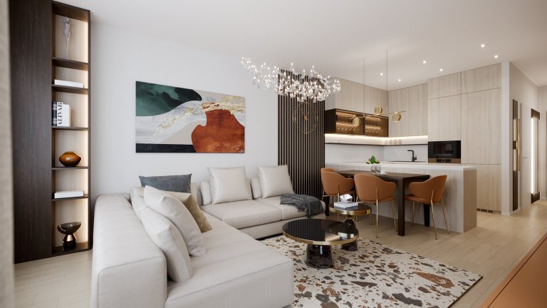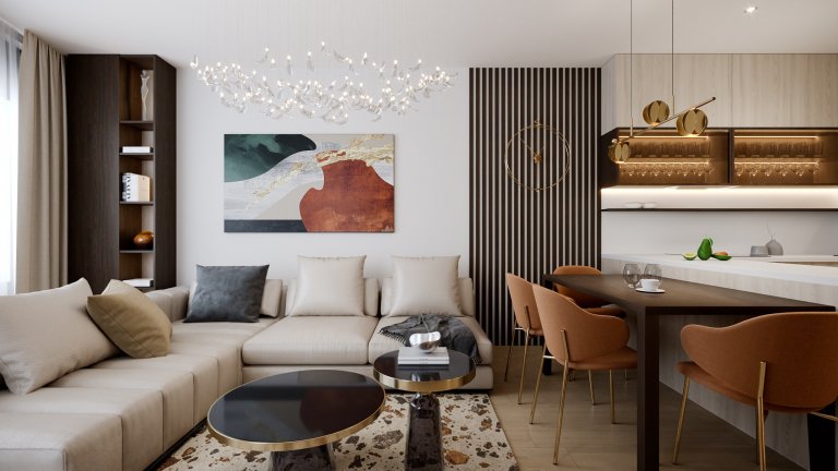 Predstavujeme vám luxusný interiérový design bytu ve Sky parku z interiérového štúdia PRUNUS. Terakotová farba v harmonickom interiéri navodí dobrú náladu a upozorní na seba. Tmavý dub na nábytkoch vytvára príjemné materiálové napätie k javorovej kuchyni.