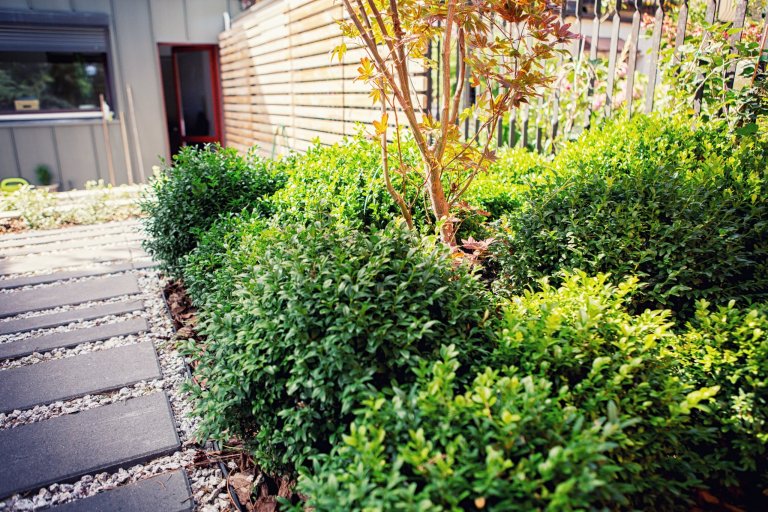 Vedle houpaček byla navržena zajímavá skupina stálezelených rostlin – kulovité zimnostrázy v pěti různých velikostech. Nad koulemi kraluje palmový javor, v krásné vínové barvě. Za houpačkou a skupinou přilehlých rostlin se na plotě rozrůstá břečťan, čímž vznikla stálezelená clona od sousedů. Podél plotu v koncové části zahrady navrženo atraktivní, keře kvetoucí bíle – hortenzie a rododendrony.