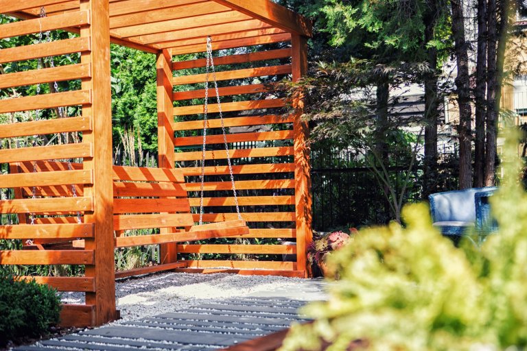 Projekt zahrady předpokládá vytvoření moderního prostoru, který by korespondoval  s tvarem domu a jeho interiérem. Jedním z důležitějších prvků bylo postavení dvou-osobové houpačky určené k rekreaci a zábavě jak pro děti, tak pro dospělé. Byl zvolen architektonicky zajímavý tvar, jelikož v zahradách této velikosti bude mít nejen funkční, ale i dekorativní poslání, jelikož bude centrálním bodem projektu.