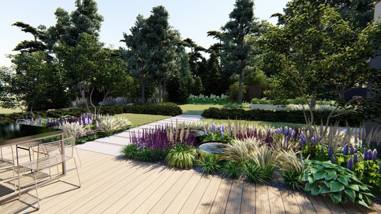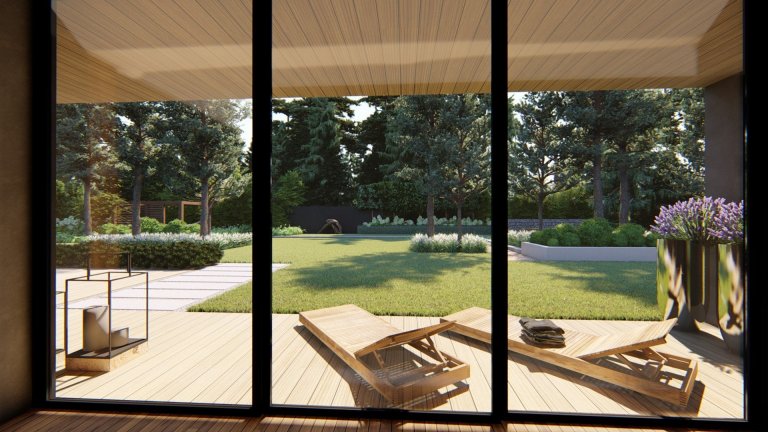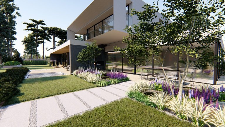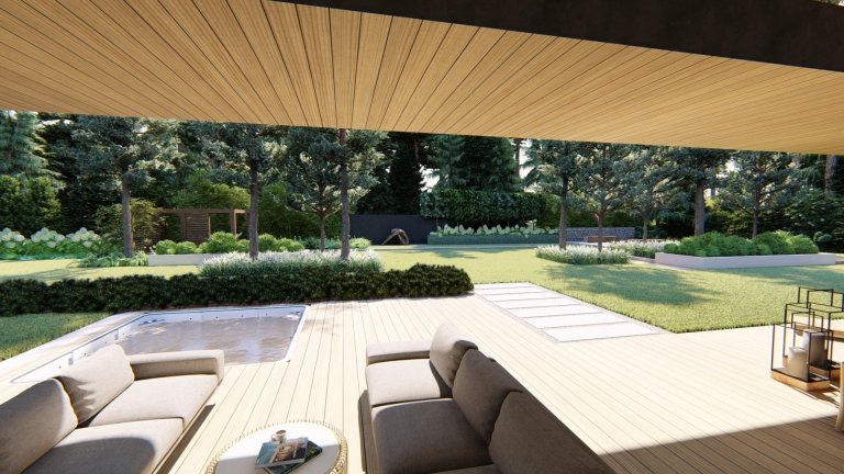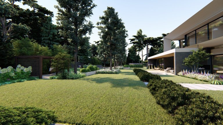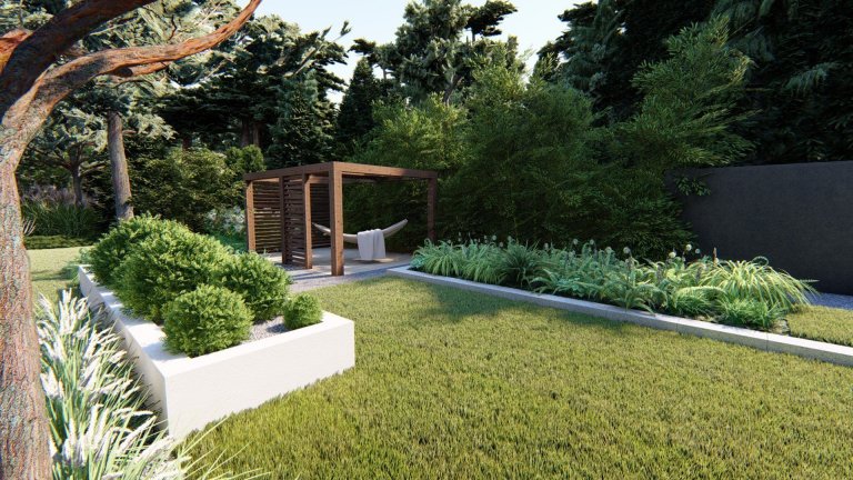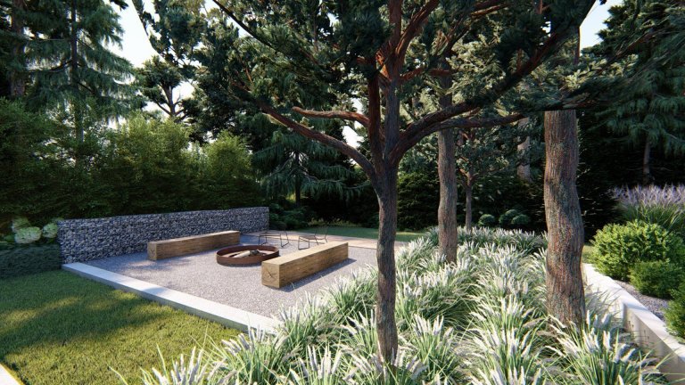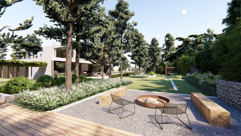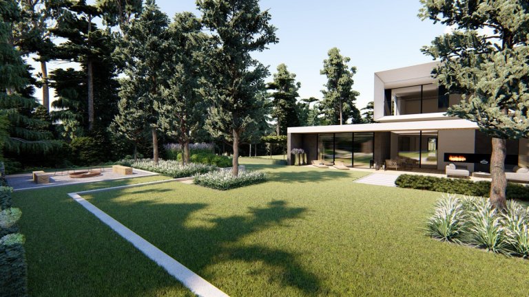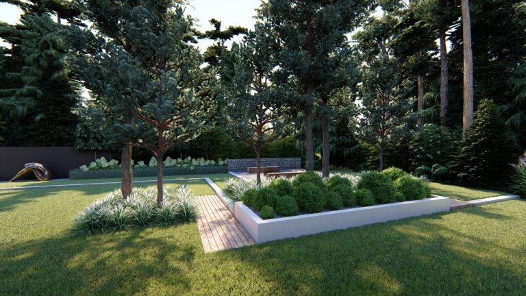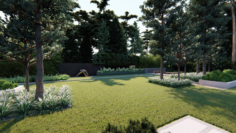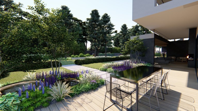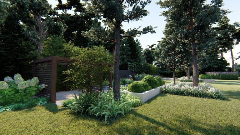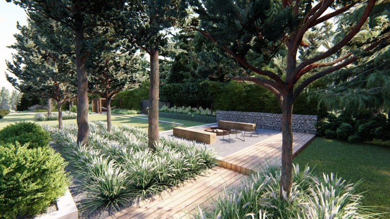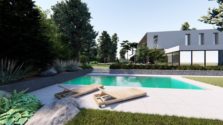 Zahradní koncept u moderní vily v blízkosti Poznani. Zahrada, která respektuje okolní přírodu a zapadá do okolního lesa :) K dispozici jsou prvky, jako je bazén, altán, velká prostorná terasa, ohniště a mnoho dalších...Dominantním dekorativním prvkem bude socha na pozadí černé stěny :)