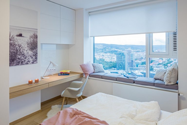 Apartmán s výhledem na město se nachází ve výškové budově na 32. patře a má severní orientaci. Interiér je pěkný ve své jednoduchosti, čistý design nábytku je oživený jeho různými povrchy a odstíny. Prostor v světlých a teplých odstínech působí čistě, jednoduše a útulně zároveň. Parkety, dveře a koupelnu jsme navrhli ze standardu, zbytek interiéru jsme řešili na míru.