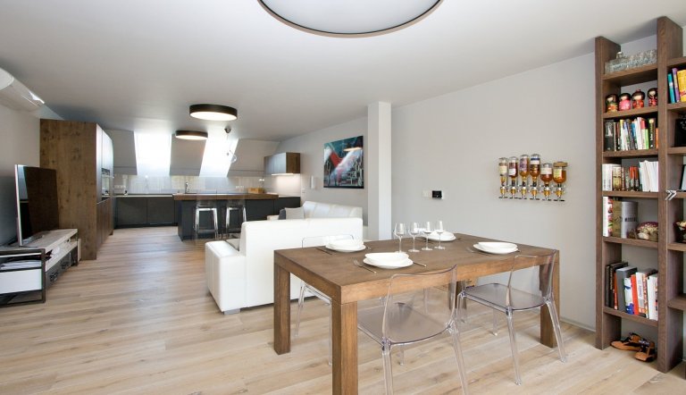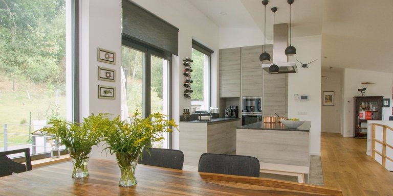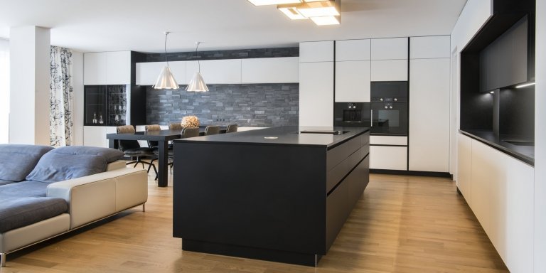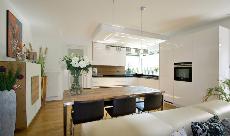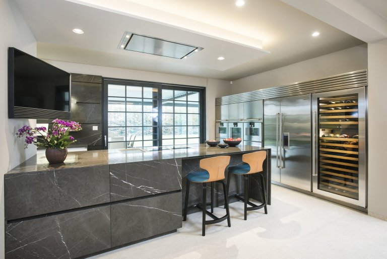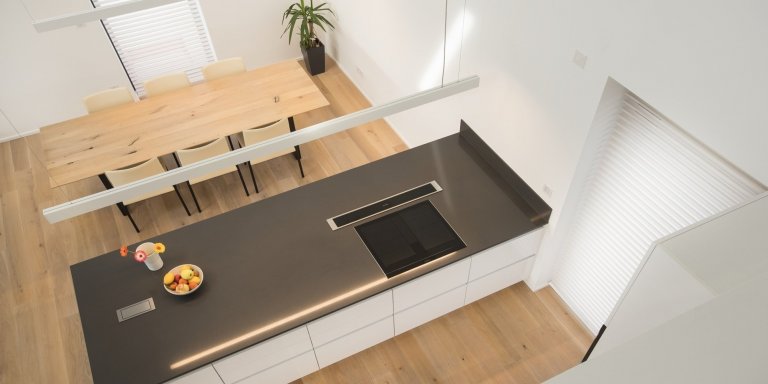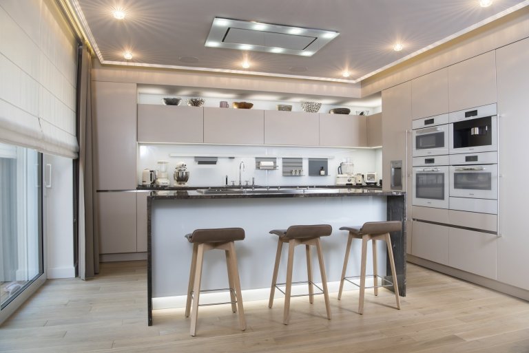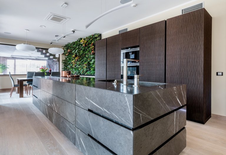 Kuchyň BEECK KÜCHEN, provedení masiv rámeček Forum A 6500 H112 beachwood astig (dub drásaný se suky), doplňky Blanco. Pracovní deska je žula Azul noche, mat. Kuchyň je vybavena spotřebiči SIEMENS, LACANCHE a LG.