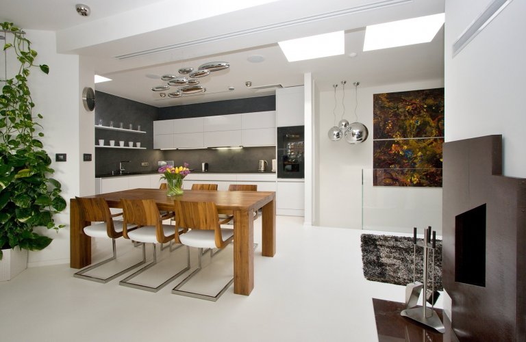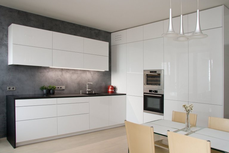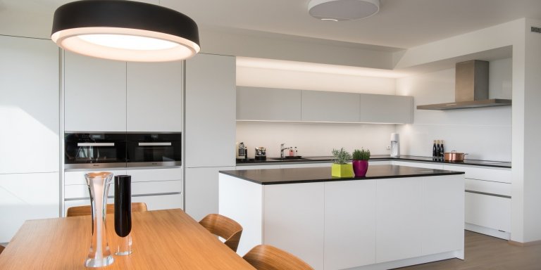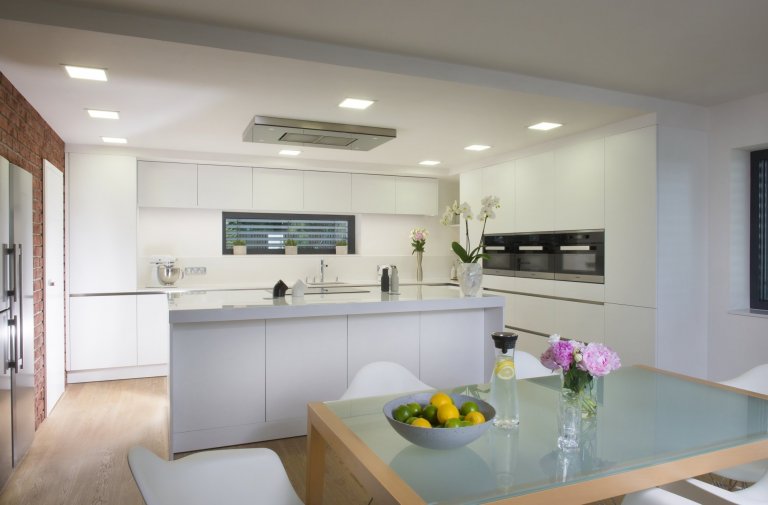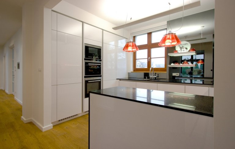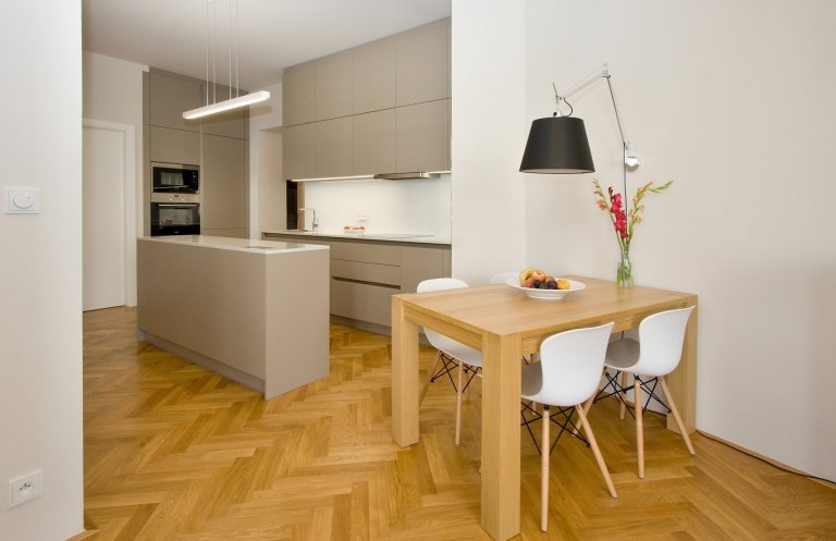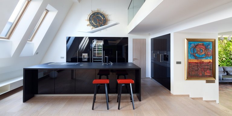 Zadání bylo prosté - navrhnout prostornou a pohodlnou kuchyň, která bude sloužit nejen k vaření, ale i k setkávání s přáteli. Jediným větším požadavkem bylo zachování americké chladničky, která v místnosti vzhledem k úzkým vstupním dveřím čekala již od hrubé stavby. A pak ještě jeden -zakomponovat nad ostrůvek historický měděný rošt na nádobí.