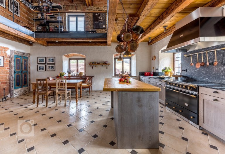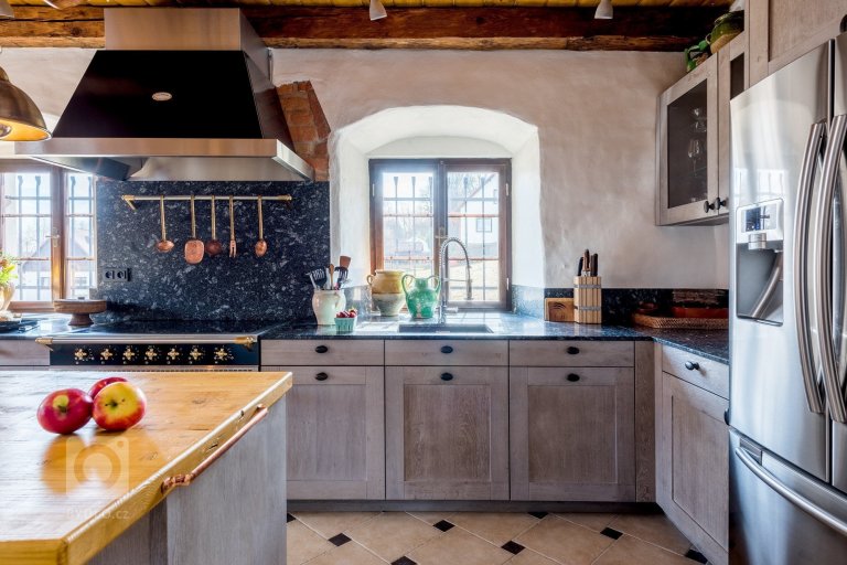 Byli jsme si vědomi, že vzhledem k historii objektu můžeme lehce šlápnout vedle. Volba padla na kuchyň značky Beeck Küchen s masivním provedením dvířek - sukatý drásaný dub. Pracovní deska je ze žuly Azul noche s matnou povrchovou úpravou. U spotřebičů je stěžejní smaltovaný sporák se dvěma troubami a sklokeramickou varnou deskou.