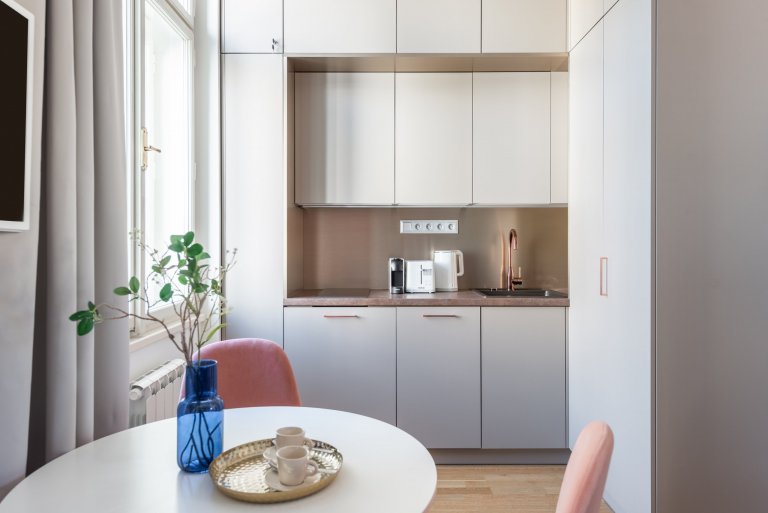 Celý byt je tvořený jednou hlavní místností a zadání bylo vyřešit úložné prostory, kuchyňskou linku, jídelní zónu a zónu na spaní v jednom kompaktním prostoru.