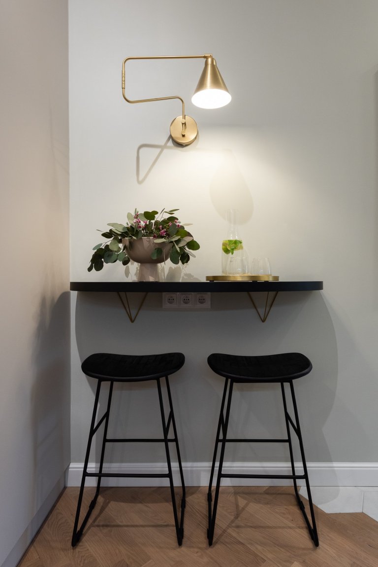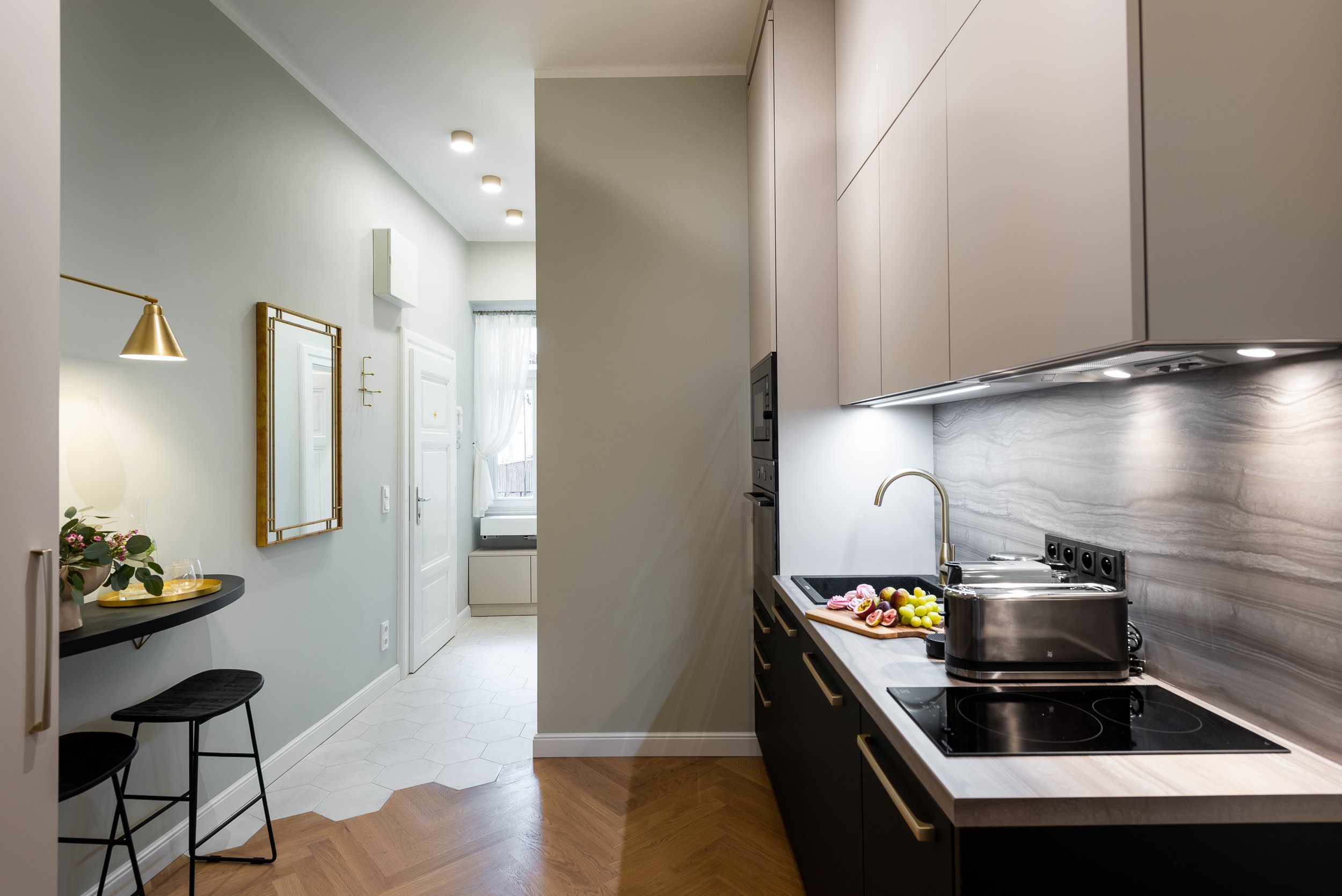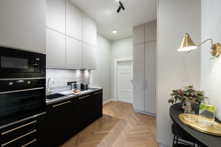 Kopletní rekonstrukce původního pavlačového bytu v centru Prahy. Původní byt byl bez sociálního zázemí. Zadáním bylo vytvoření interiéru odpovídající moderním parametrům bydlení.