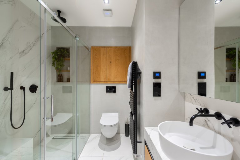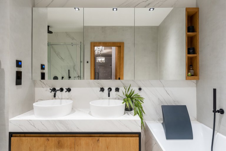 Koupelna prošla i změnou původní dispozice a nový prostor umožnil umístit vanu i veliký sprchový kout. Barevně jsme zopakovali užití dřevo, stěrka a černé detaily. Zde je navíc na stěnách a podlaze velkoformátová dlažba s dekorem mramoru.