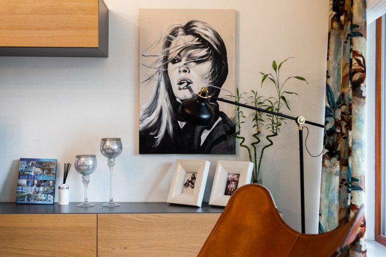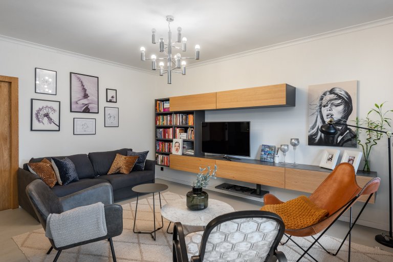 Obývací pokoj spojený s jídelní částí a kuchyní je spojením části, kde se vaří, schází rodina , přátelé , ale i místem pro relaxaci v křesle. Křesla jsou směsicí designového "butterfly" , ale i repasovaného bazarového houpacího křesílka. Sedačka splňuje i funkci spaní, neb se dá rozložit do dvoulůžka.