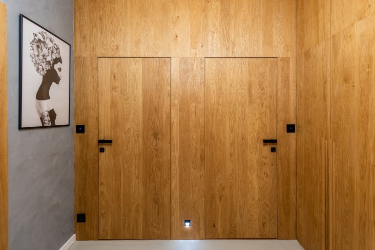 Hlavním spojovacím prvkem interiéru je kartáčovaný dub. Rozhodli jsme se pro značku Admonter, která má na výběr velké množství deskovin o různých tloušťkách. Je tedy možné použít stejný dekor na dveře šatní skříně ale i na zakázku vyráběné dveře, které jsou skryté ve stěně.