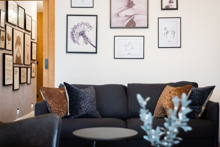 Dub doplňují akcenty šedé a černé a to buď na textilu, nebo a podlaze, která je mimo ložnice beton epoxidová stěrka. Stejně tak se odstín šedé zopakoval na kuchyňské lince, která je ručně natíraná a celkově z masivu.