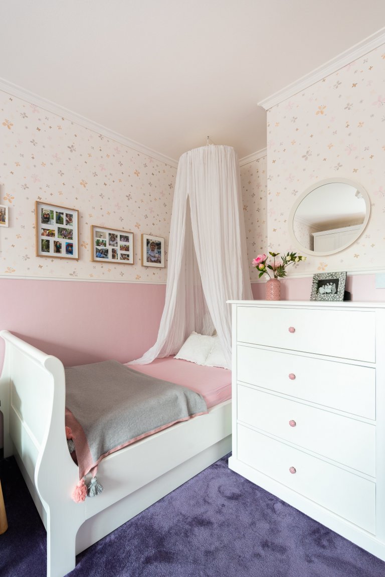 Dětský pokojíček slouží 7leté slečně, která se již ráda podílí na zařízení a výběru doplňků. Jako správná princezna inklinuje k růžovým barvám a něžným motivům.