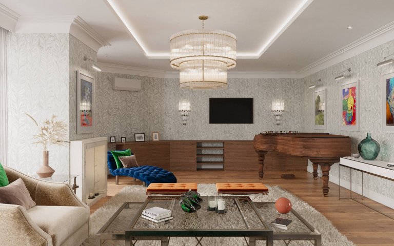 Stěny jsou pokryty hedvábnými tapetami Zinc v dekoru západu slunce. Toto téma se prolíná celým pokojem a spojuje jednotlivé prvky.