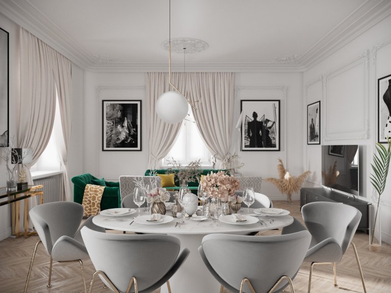Závěsy jsme zvolili opět z hevábí se zlatými odlesky a doplňuje je jemná záclonka.