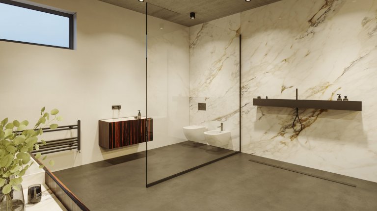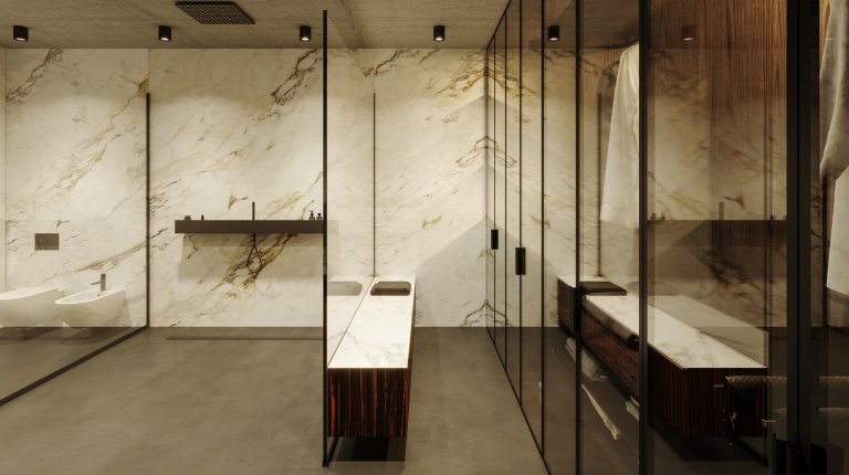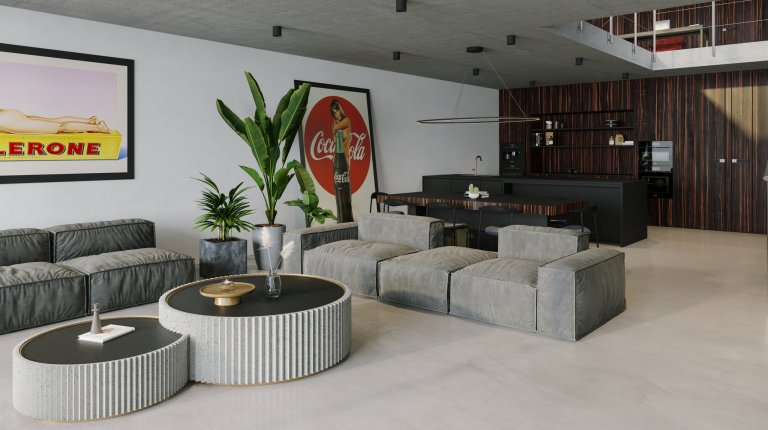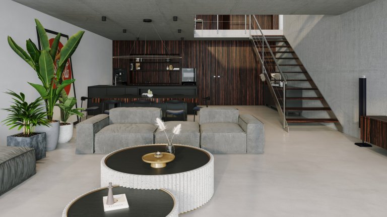 Hlavní roli hraje makasar, betonová stěrka, přiznaný beton, antracit a off white, v koupelnách doplněno o pravý mramor.