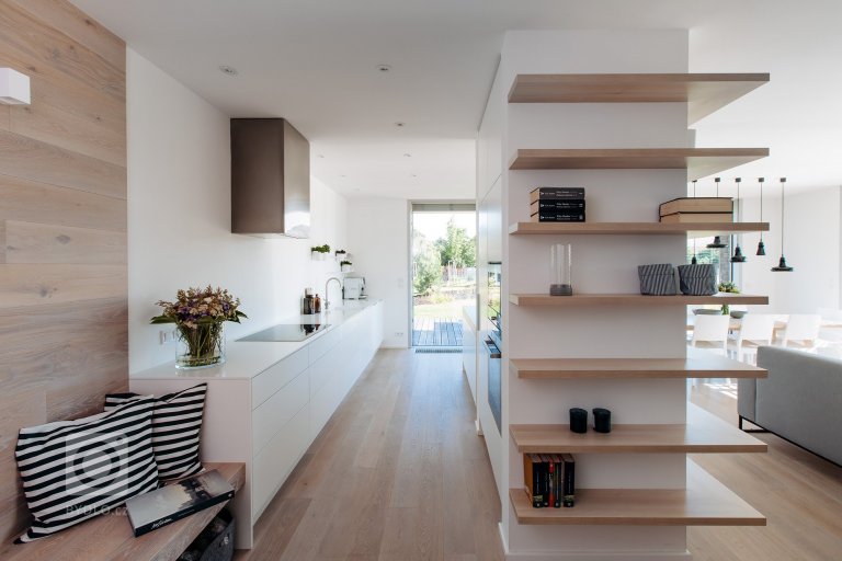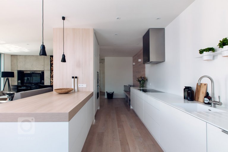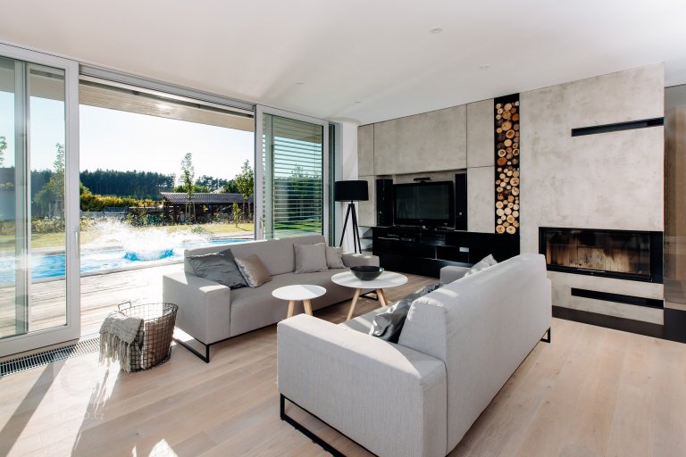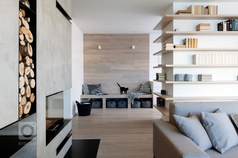 SMLXL spolupracovali s klienty od samého začátku. To se propisuje do přehledně uspořádaných prostor a jejich pevných částí, jako jsou kvalitní šedá dřevěná okna, masivní dubové podlahy či perfekcionisticky provedený vestavěný nábytek na míru. To dokazuje nejen včasný vstup architektek do projektu, ale i důležitost technického provedení v celku i detailu. Výšky podlah, bezprahové přechody mezi terasou a interiérem, výstupy větrání v podlahách lícující s hranou okna. Takto nenápadné a často přehlížené detaily mají obrovský podíl na kvalitě výsledku.
