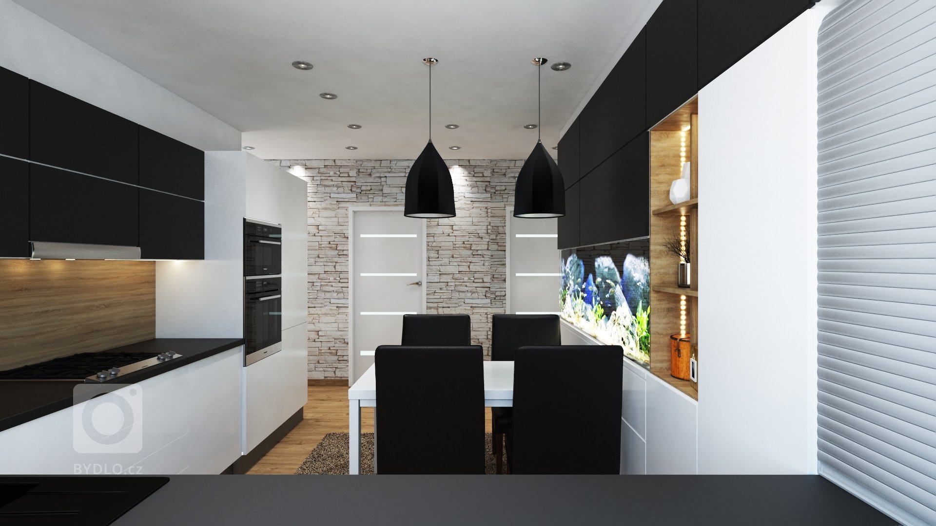 Moderní kuchyně s jídelnou a zabudovaným akváriem.