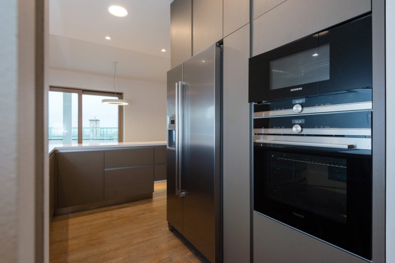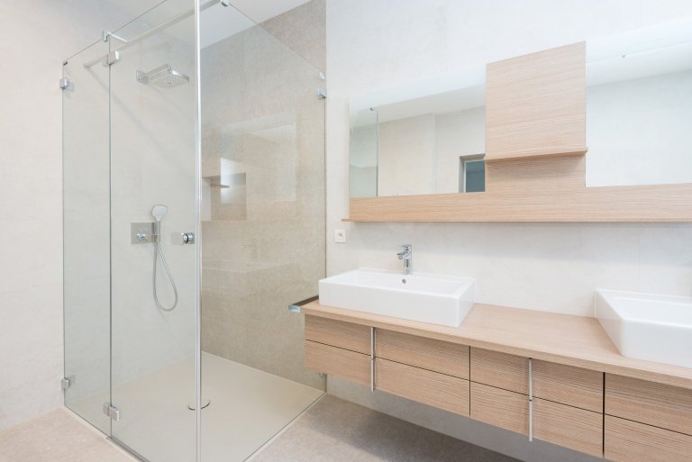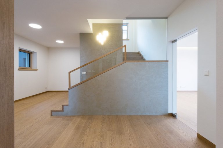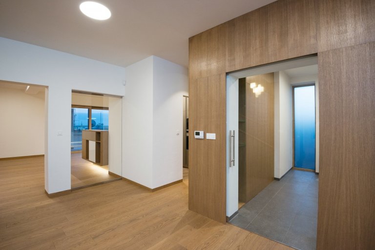 Elegantný a moderný interiér rodinného domu realizovaný pomocou prírodných materiálov v kombinácii s umelým kameňom a lamino povrchom.