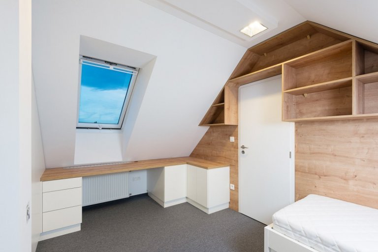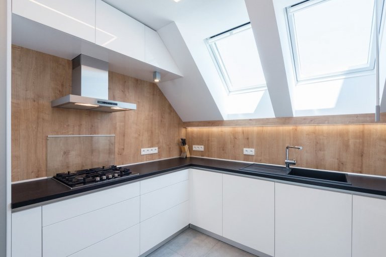 Exkluzívny a štýlový interiér bytu v nadstavbe bytového domu na Kadnárovej ulici v Bratislave. Povrch nábytku vo vysokom lesku, pohľadový betón a netradičné schodisko je len časťou toho, čo tento exkluzívny byt vie ponúknuť. Výrazným prvkom je schodisko vytvorené z dvoch častí nábytku. Zámerom rozdelenia schodiska na dve časti bolo spojenie funkcie úložného priestoru pod schodiskom ako aj zábradlia. Iné zloženie prechodu medzi dvoma úrovňami bytu umožní vytiahnuť obyvateľa ako aj návštevníka zo sveta rutiny.Naša spoločnosť riešila celý interiér bytu od hrubej stavby, až po finálny výsledok. Autorom návrhu interiéru je Mgr. art. Tomáš Augustín – www.architektonizer.sk.