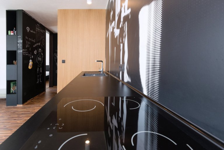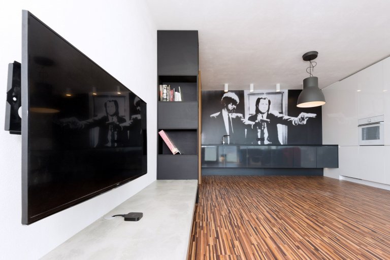 Krásny a štýlový byt v novostavbe, ktorý zodpovedá povahe majiteľa a aktuálnym trendom v interiéri. Využitá nápaditosť v štýle filmového ducha „Pulp Fiction“. Pod návrh interiéru sa podpísal Ing. arch. Martin Bujna, stoličky v kuchyni dodalo štúdio Roomfactory