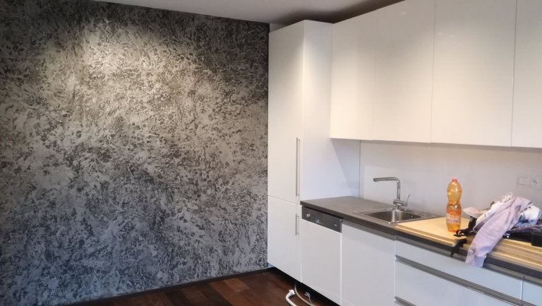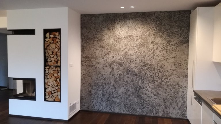 Záměr investora bylo vytvořit kontrastní dramatickou stěrku. Připravili jsme pro zákazníka několik vzorků ze kterých si vybral. realizovaný vzor.