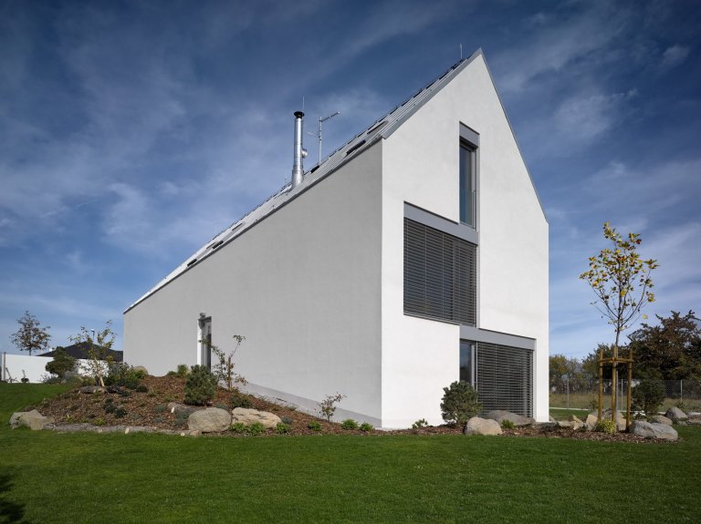 Materiály jsou voleny střídmě a dávají domu zklidňující charakter. Společně s minimalistickými detaily nechávají vyniknout proporcím a tvaru. Kombinace bílé hladké omítky se světlou plechovou střechou a přírodními hliníkovými okny se propisuje i do interiéru, do světlých neutrálních odstínů podlahy a nábytku.