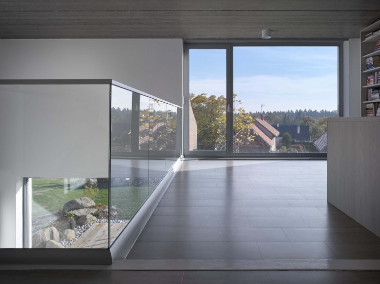 Obývací pokoj, zapuštěný do svahu, je dle definice ze zákona suterénem, to znamená, že má dům stále jedno nadzemní podlaží a podkroví! Sklon hřebene proti svahu kopíruje vnitřní prostorové uspořádání, nezvyklá forma domu tak odpovídá příčnému rozdělení půdorysu a posunu úrovní o poloviční výšku patra.