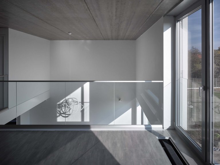 Sklon pozemku byl na délce domu asi 1,5 metru, tedy polovinu výšky jednoho podlaží. O stejný rozdíl jsme se rozhodli posunout vzájemně i jednotlivé podlahy – v příčném řezu má dům nakonec 6 výškových úrovní. Díky tomu je do domu bez ohledu na svažitost přímý vstup/vjezd z ulice. Odtud lze sestoupit do obývacího pokoje s kuchyní a jídelnou na úroveň zahrady. Prostor se otevírá do následujícího podlaží, na galerii s pracovnou. Schodiště dále stoupá kolem dětských pokojů se šatnou a koupelnou až k hlavní ložnici doplněné podobným zázemím. Nejníže položená část domu obsahuje technické zázemí.