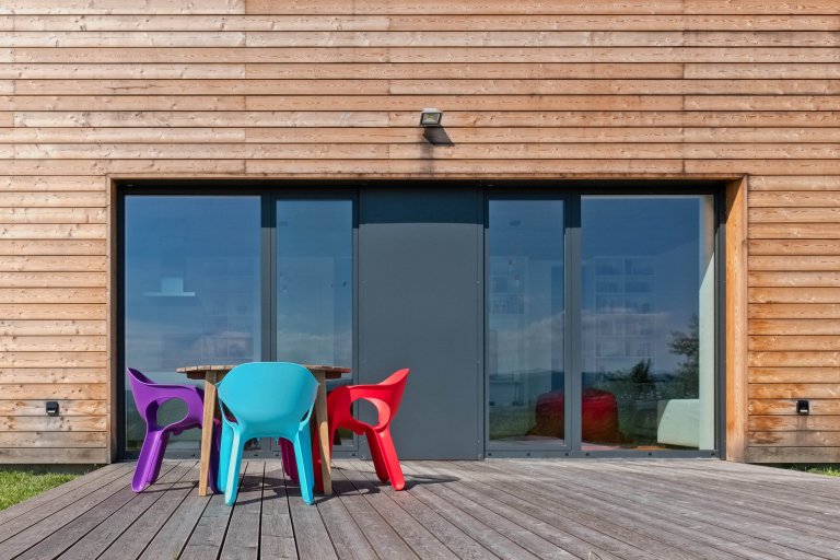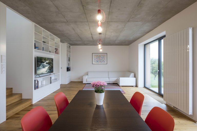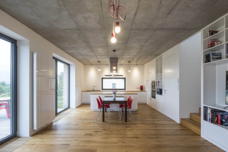 Klimatické podmínky horského prostředí jasně definovaly požadavky uživatele. Jednoduše, prostě a pragmaticky je řešen malý levný dům na úpatí Ještědu. Archetypální forma se stává přirozenou součástí okrajové rezidenční části Liberce. Minimální rozměry stavby, kdy užitná plocha domu bez garáže je cca 110 m,2 vyžaduje návrh až strojařský přístup. Všechny prostory od technické místnosti až po obývací pokoj jsou řešeny na milimetr, včetně rozmístění nábytku a umístění věcí v něm. Jen tak je možné docílit toho, že i přes malé rozměry při návštěvě nabydete dojmu prostorného a komfortního bydlení, protože v domě není žádné promarněné místo. Vše je účelné a prostorově úsporné a přitom útulné, jako vlčí doupě. Majitelé preferovali přírodní materiály. Modřínové obložení fasády je ponecháno vlivu počasí tak, aby časem získalo stříbrnou patinu. Na střeše je použit předzvětralý titanzinek. V interiéru dominuje pohledový betonový strop v kontrastu s dřevěnou podlahou. Vestavěný nábytek je pak v neutrální bílé barvě. Jedná se o dům, kde majitelé chtějí být skutečně pány a nikoli otroky svého domu; kdy rodinný dům chápou jako účelný prostředek na bydlení a nikoli výstavní dědictví pro další generace.