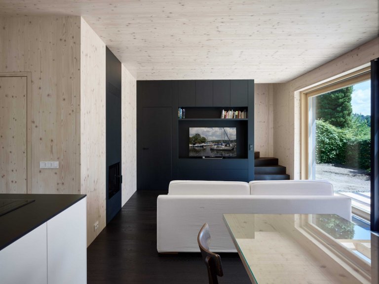 Chatová oblast u slapské přehrady se pomalu proměňuje v rezidenční osadu. Rodinný dům stojí na místě rekreačního objektu, jehož uspořádání ani technické vlastnosti již nevyhovovaly investorovým nárokům, a zachovává pouze jeho půdorysnou stopu. Dispozici nevelké stavby předurčil jižní svah s terénním zlomem. Vstup se nachází v ložnicovém patře a s pozemkem jej spojuje lávka. Ze zádveří sestupuje schodiště do obytného prostoru s kuchyní, který rozměrným prosklením a terasou s pergolou navazuje na jižní část zahrady. Konstrukci domu tvoří masivní dřevěné panely s tepelnou izolací minerální vatou a provětrávanou mezerou za velkoformátovým obkladem z cementovláknitých desek. S antracitovým odstínem fasády kontrastuje světlé dřevo okenních rámů a pergoly, stejně jako žlutý lak ocelové lávky. Výraz interiéru udávají především přiznané smrkové panely.