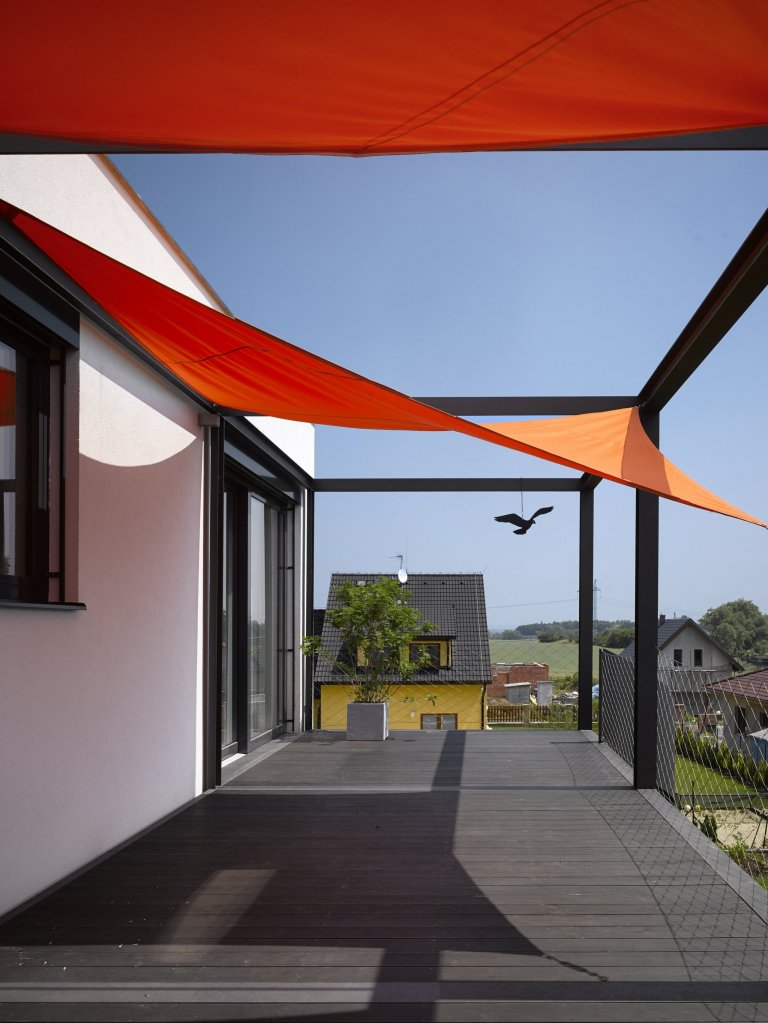 Obytné místnosti tak musely být přesunuty do patra. Tuto dispoziční anomálii a požadavek venkovního krytého stání pro auta řeší ocelová konstrukce u jižní fasády. Zajišťuje navíc propojení se zahradou přes točité schodiště, vytváří velkorysou terasu stíněnou plachtami a zajišťuje tak i stínění pokojů v letních měsících. Navíc konstrukce tvoří krytý vstup do domu a v neposlední řadě díky ocelové síti i konstrukci pro popínavé rostliny.