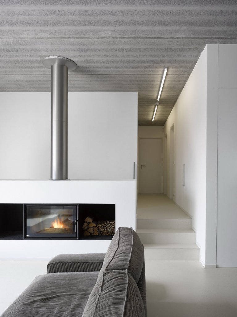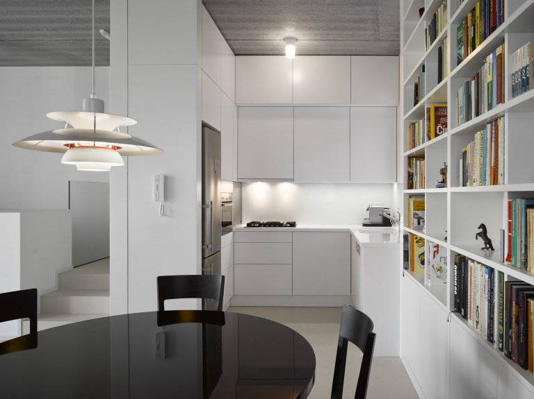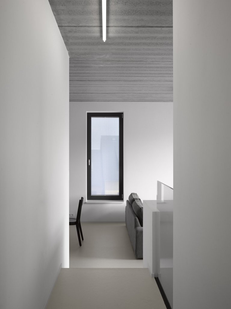 Uvnitř domu jsou různé výšky podlah a stropů. Požadavek na vysoký strop v dílně vyvažuje běžná výška ložnic, a naopak převýšený obývací prostor dorovnává výšku stropu kanceláře v přízemí. Samotné proporce a průhledy z obývacího pokoje byly dostatečně zajímavé na to, aby byl dům ponechán střídmý v bílé barvě v kombinaci s pohledovým betonem stropu. Prostoru dominuje velká knihovna, která působí svou barevností jako velkoformátové moderní plátno.