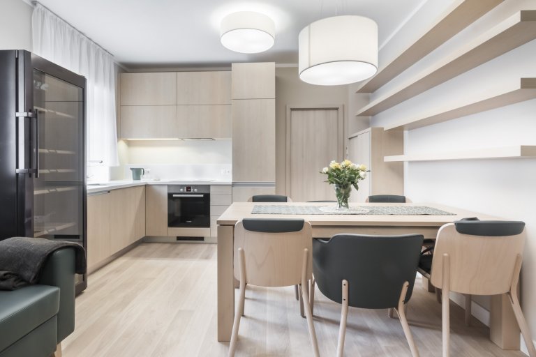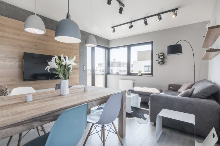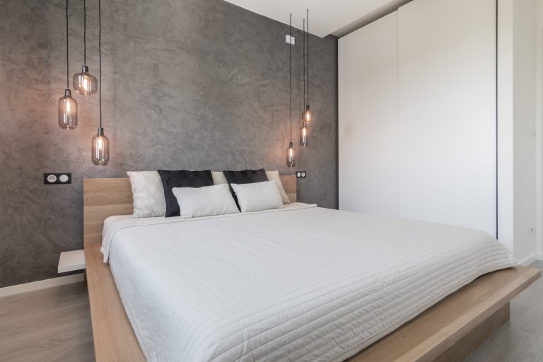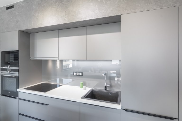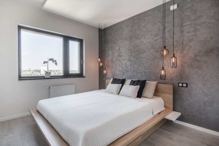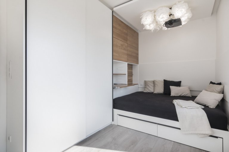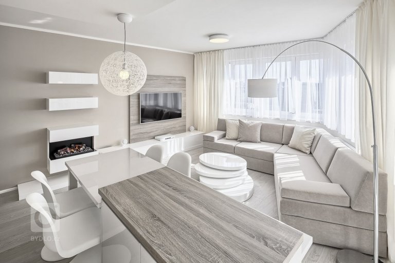 Developerský projekt JRD, podchycení klientských změn a návrh interiéru vybavení bytu pro mladý pár. Z návrhu vyplynulo použití cementové stěrky na většinu stěn v celém bytě i koupelně. Barvy jsou laděny od černé přes šedou do bílé s použitím dekoru masivního dubu jako doplňku přírodního prvku. Lakované bezfalcové dveře s klikami M&T bez spodních rozet umocňují minimalistické pojetí interiéru. Pokoj pro hosty je nyní zařízen také jako domácí kino s projektorem a postelí zabudovanou do skříňové sestavy.