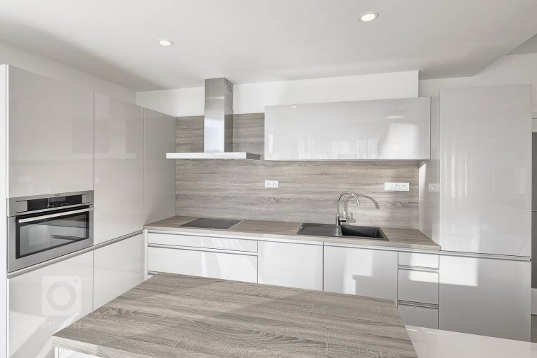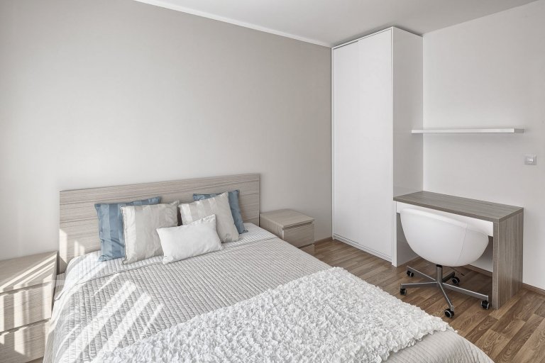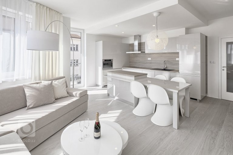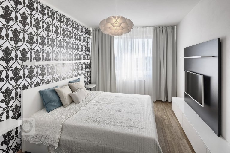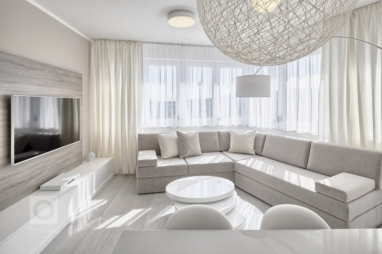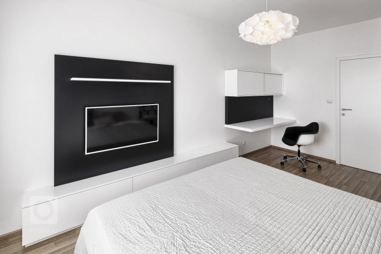 Byt pro mladou studentku a spolubydlící. Developerský projekt. Návrh interiéru v útulném stylu a potlačených krémových barvách. Kuchyňská linka v lakovaném provedení doplněná kresbou dřeva zopakovaném na televizní v stěně. Otevřený úhel v obývacím pokoji vyplnila sedací souprava na míru. Oblíbený motiv tapety byl použit na stěně v ložnici majitelky, kde převládá černobílá kombinace interiéru.