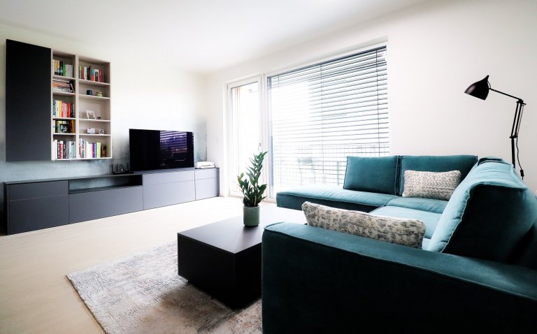 Bydlení Braník je nový pražský rezidenční areál, ve kterém jsme v jednom z bytů realizovali tento obývací pokoj s kuchyní.