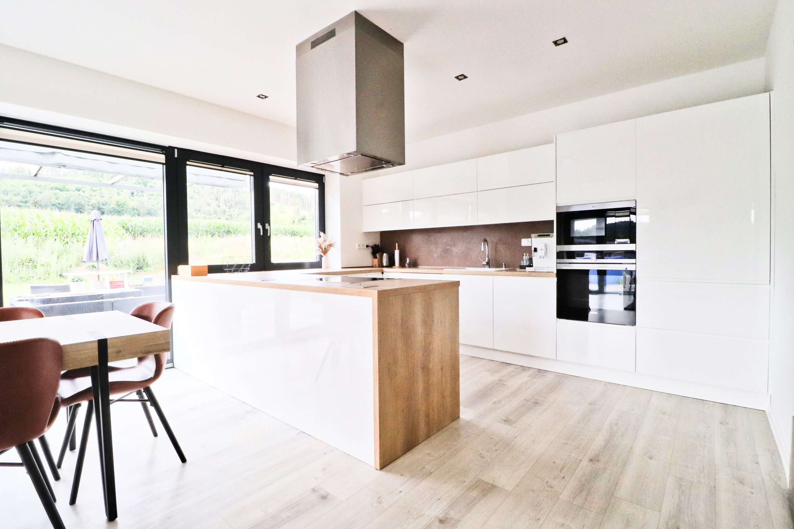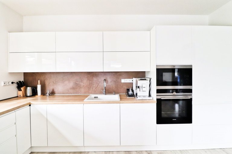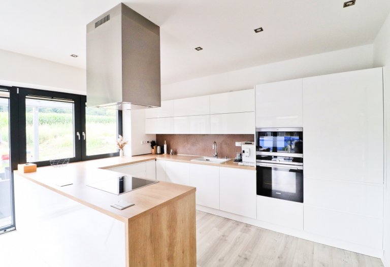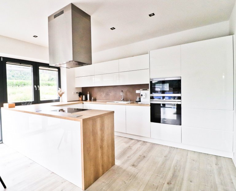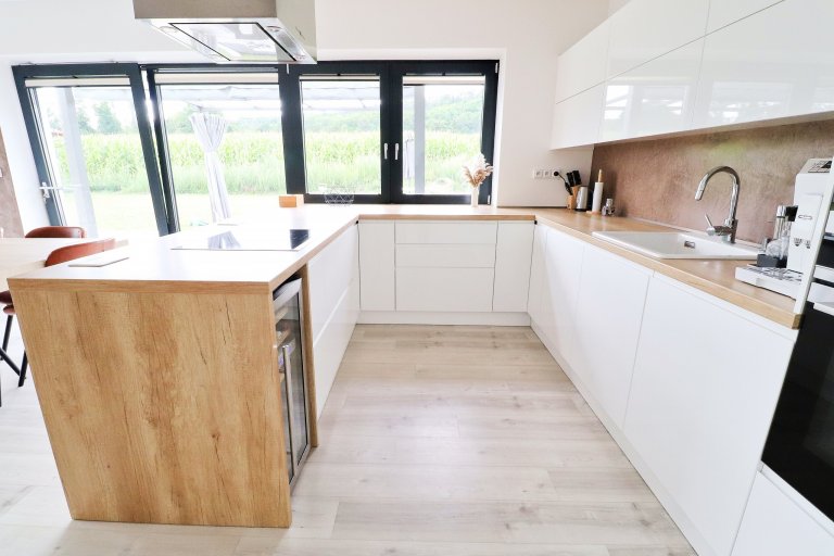 Pro mladou rodinku jsme vyrobili tuto lakovanou kuchyňskou linku s vyfrézovanými úchyty.