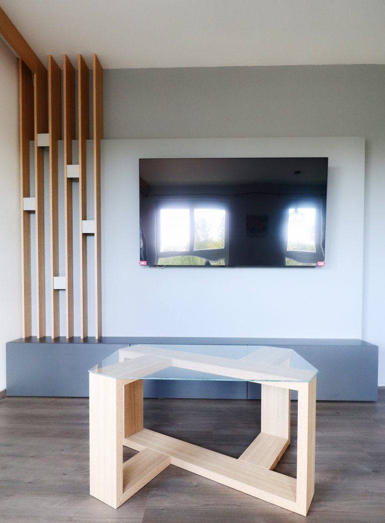 V pražském bytě mladého páru jsme realizovali kuchyňskou linku, TV stěnu podsvícenou LED pásky a nábytek do obývacího pokoje právě v těchto barvách.