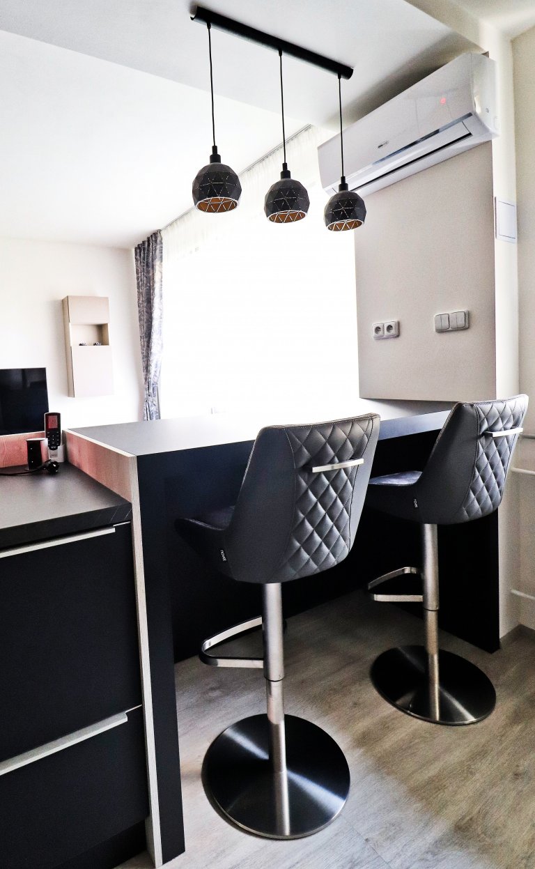 Na navazujícím vyvýšeném baru se přes den často pracuje, ale večer slouží k posezení u skleničky dobrého vína.