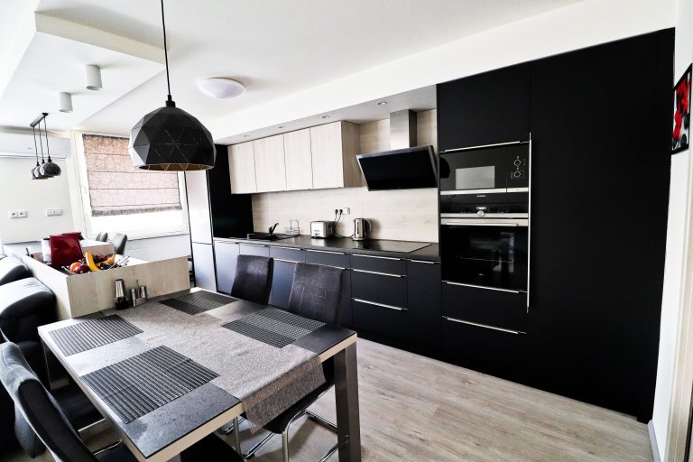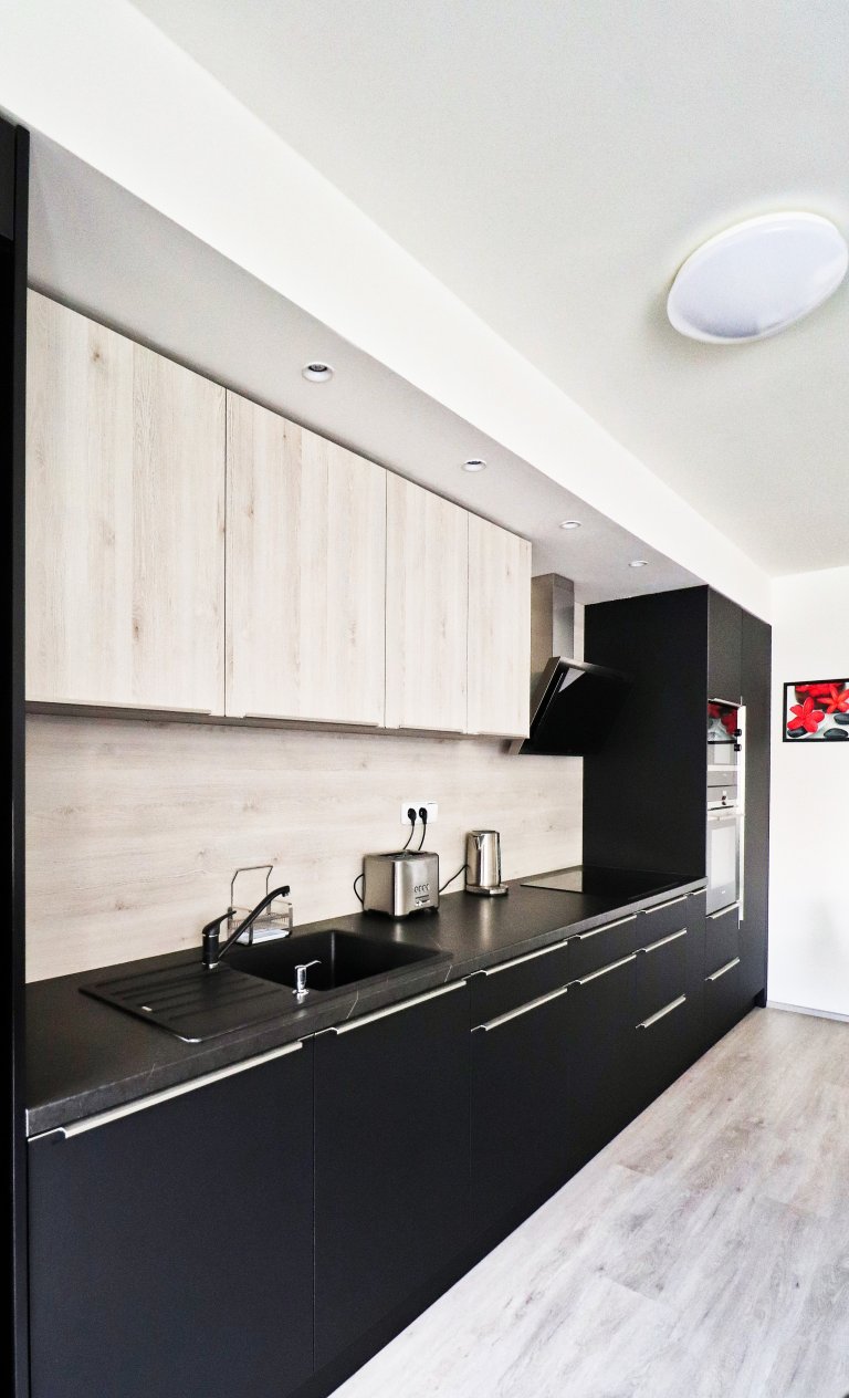 Matná černá a světlé dřevo je kombinace, která moderním kuchyňským linkám prostě sluší.